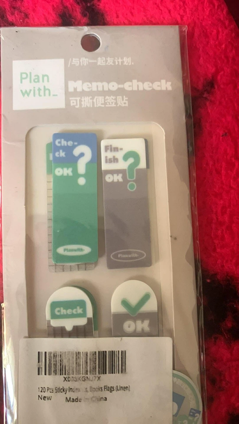 184I'm selling a brand new set of 120 sticky index and book flags! These are perfect for planning and memo-checking. They are linen and come in a pack with different designs like 'Check' and 'Finish'. Pick up cash only