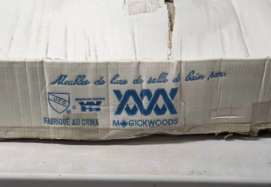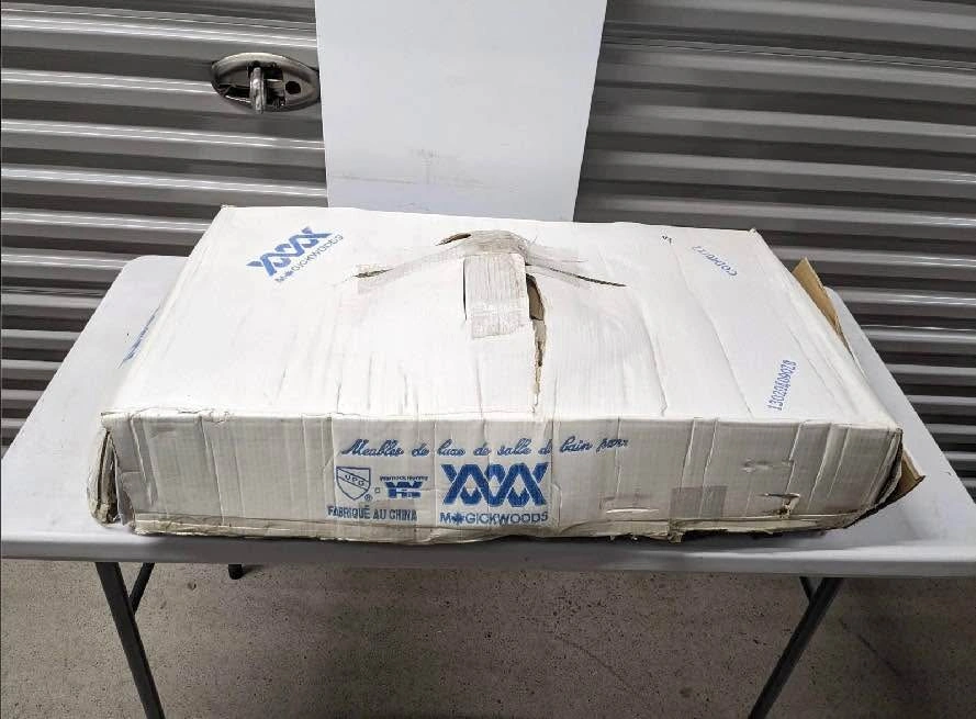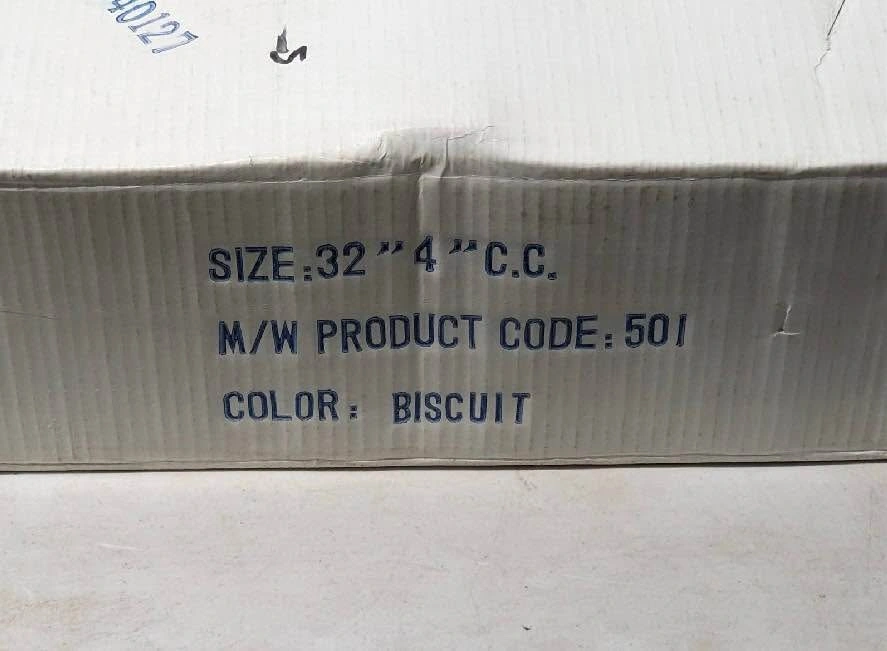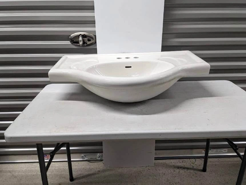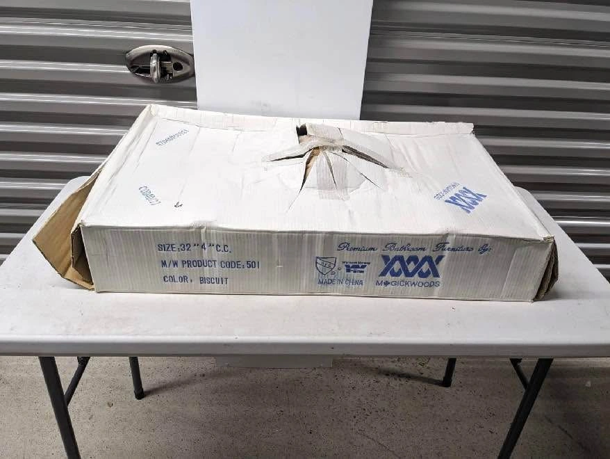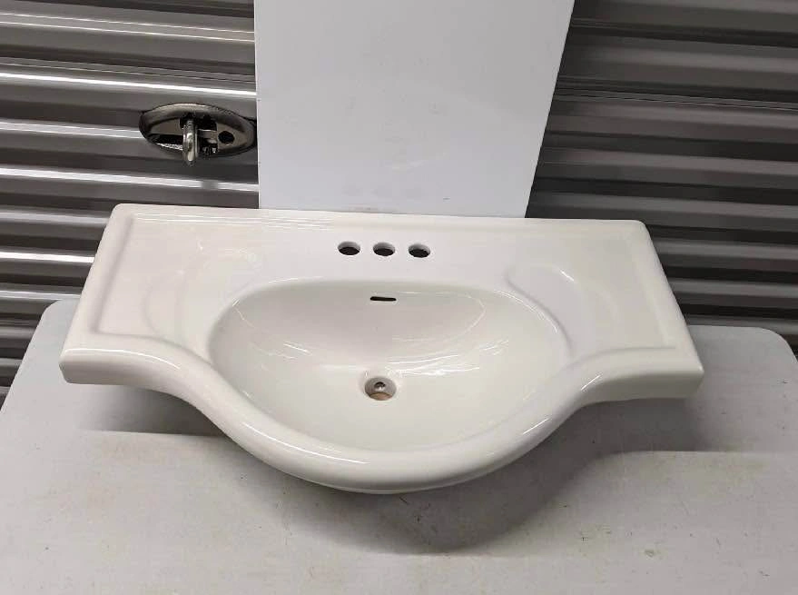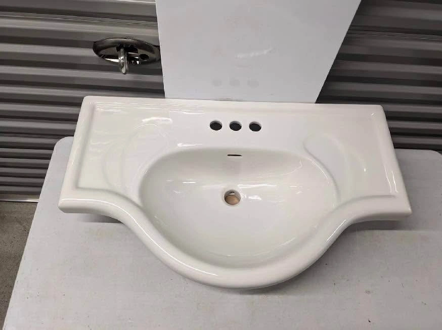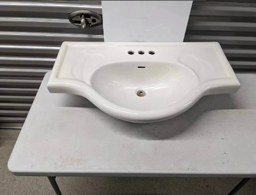 Sink, 32" Wide. NEW $278 Magickwoods ceramic lavatory sink in biscuit color, 32 inches wide, with 4-inch center spacing for faucet installation. Features a rounded basin and integrated side counters. Item appears new and is still in its original packaging. Model number 501. 2pcs - 200$ each