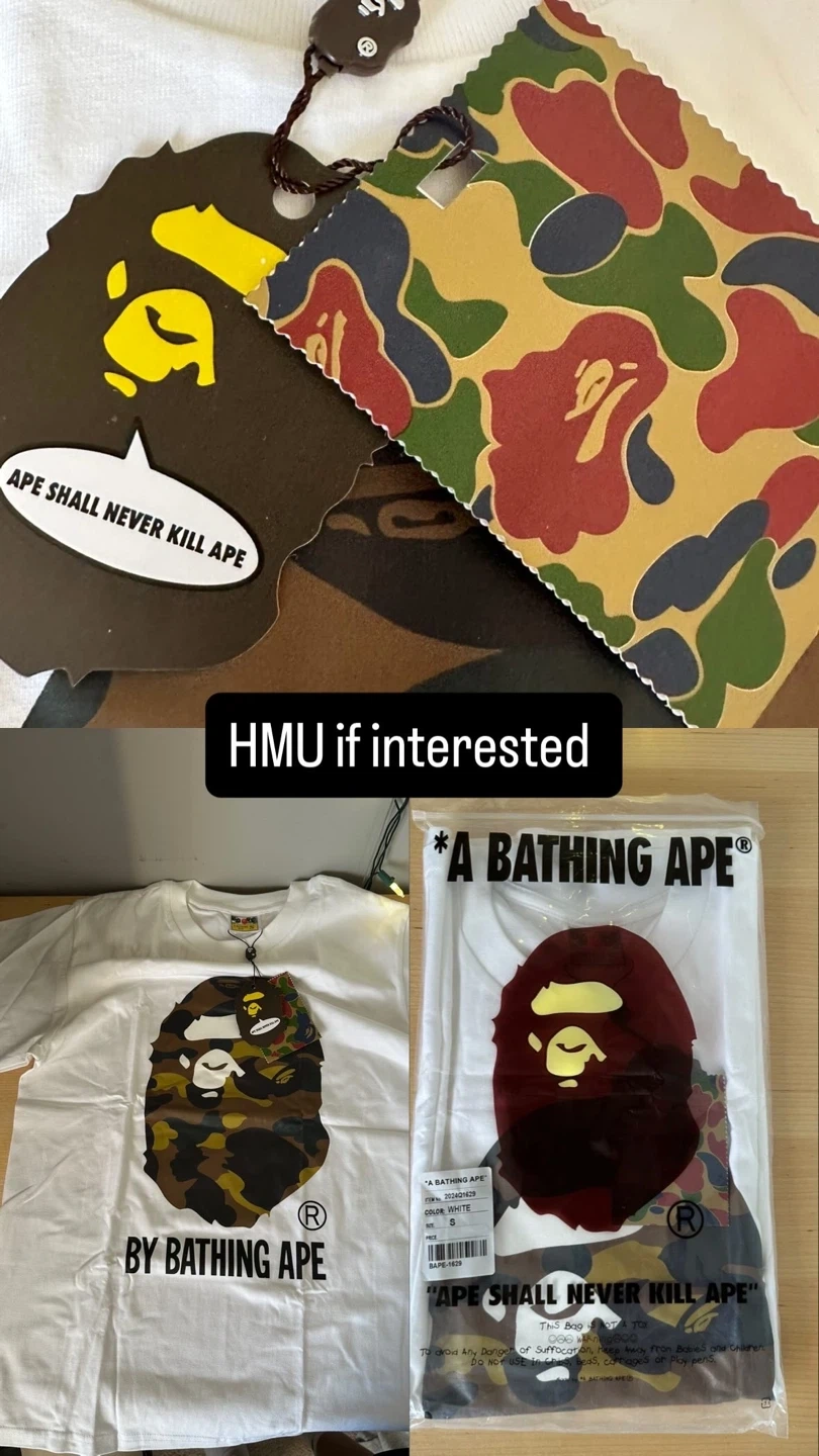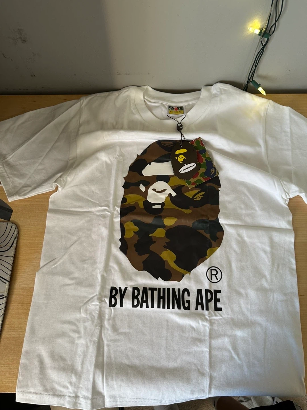 I'm selling a brand new A Bathing Ape (BAPE) t-shirt! It's white, size medium, and still in the original packaging. The design features the iconic BAPE camo pattern. Super cool shirt! (1:1) price is firm