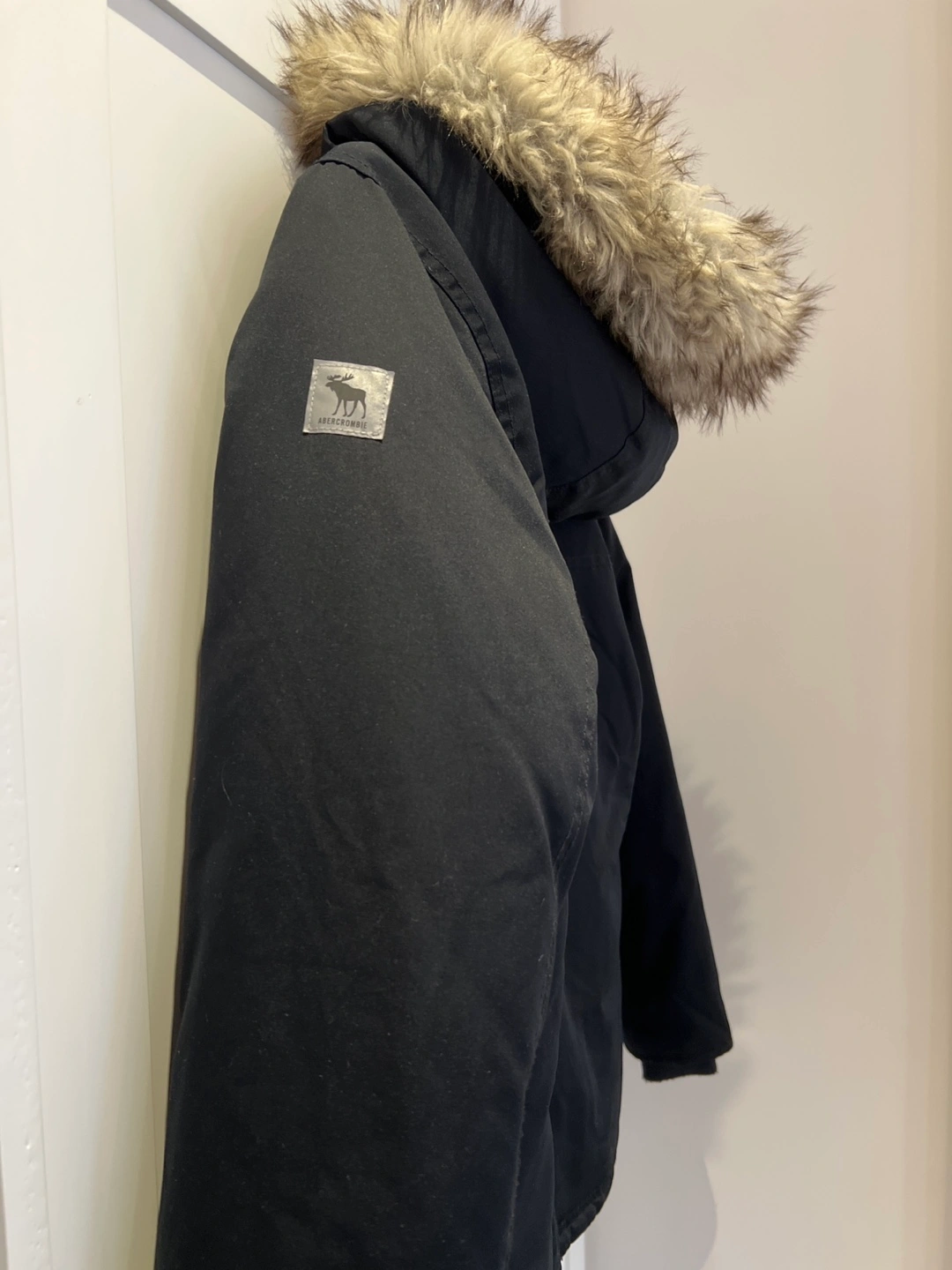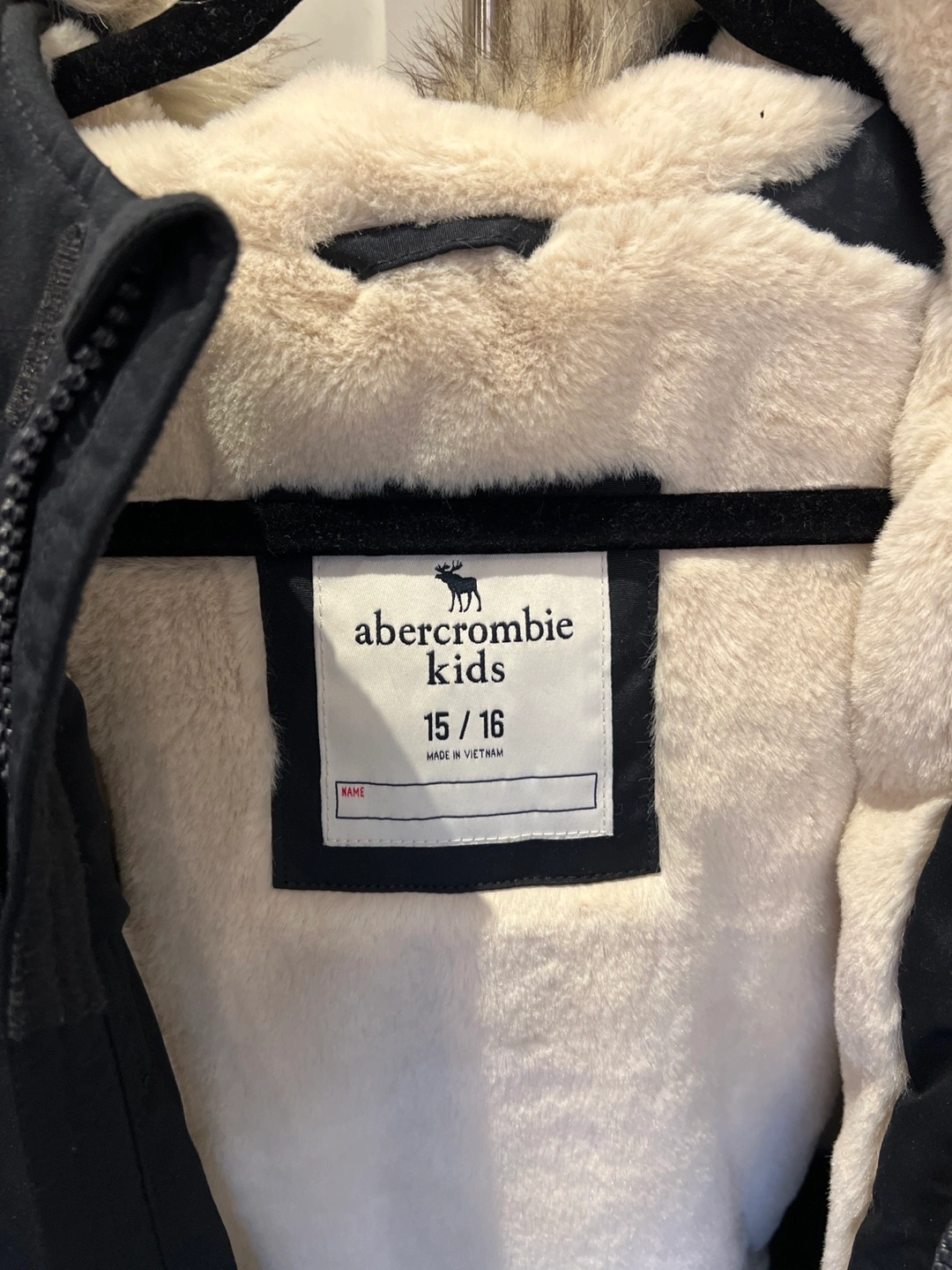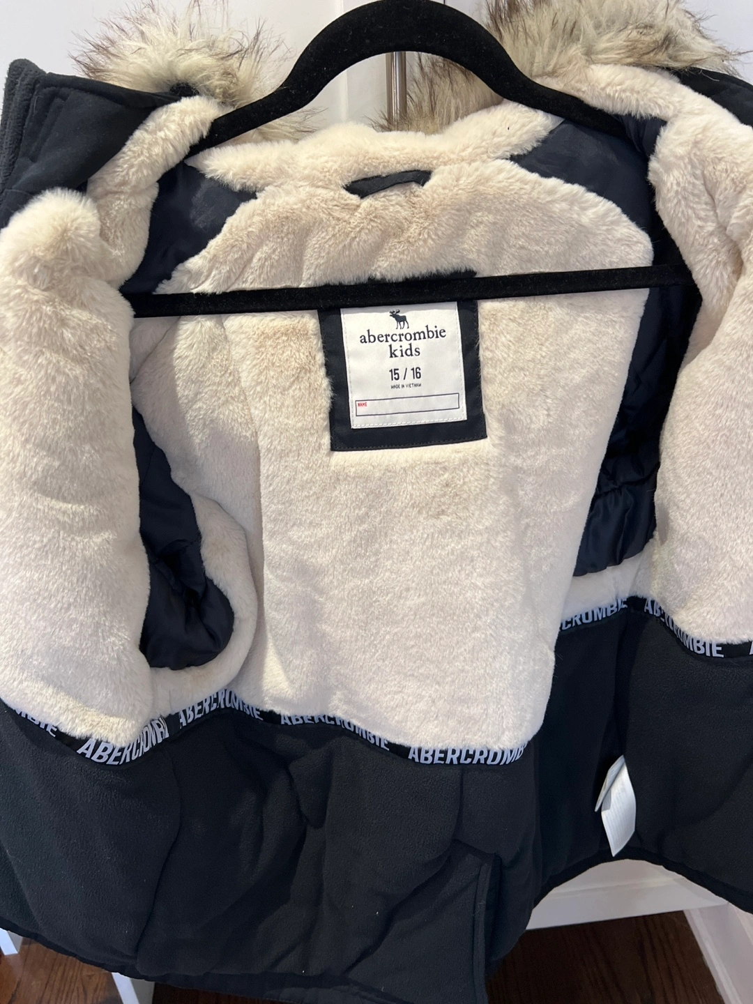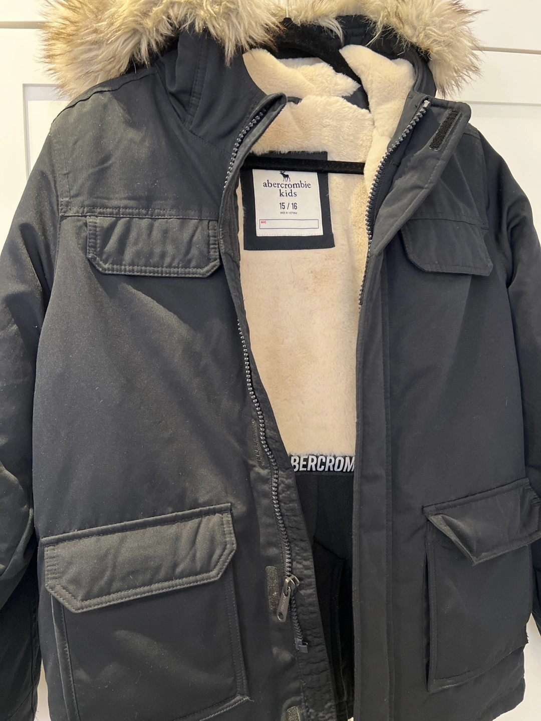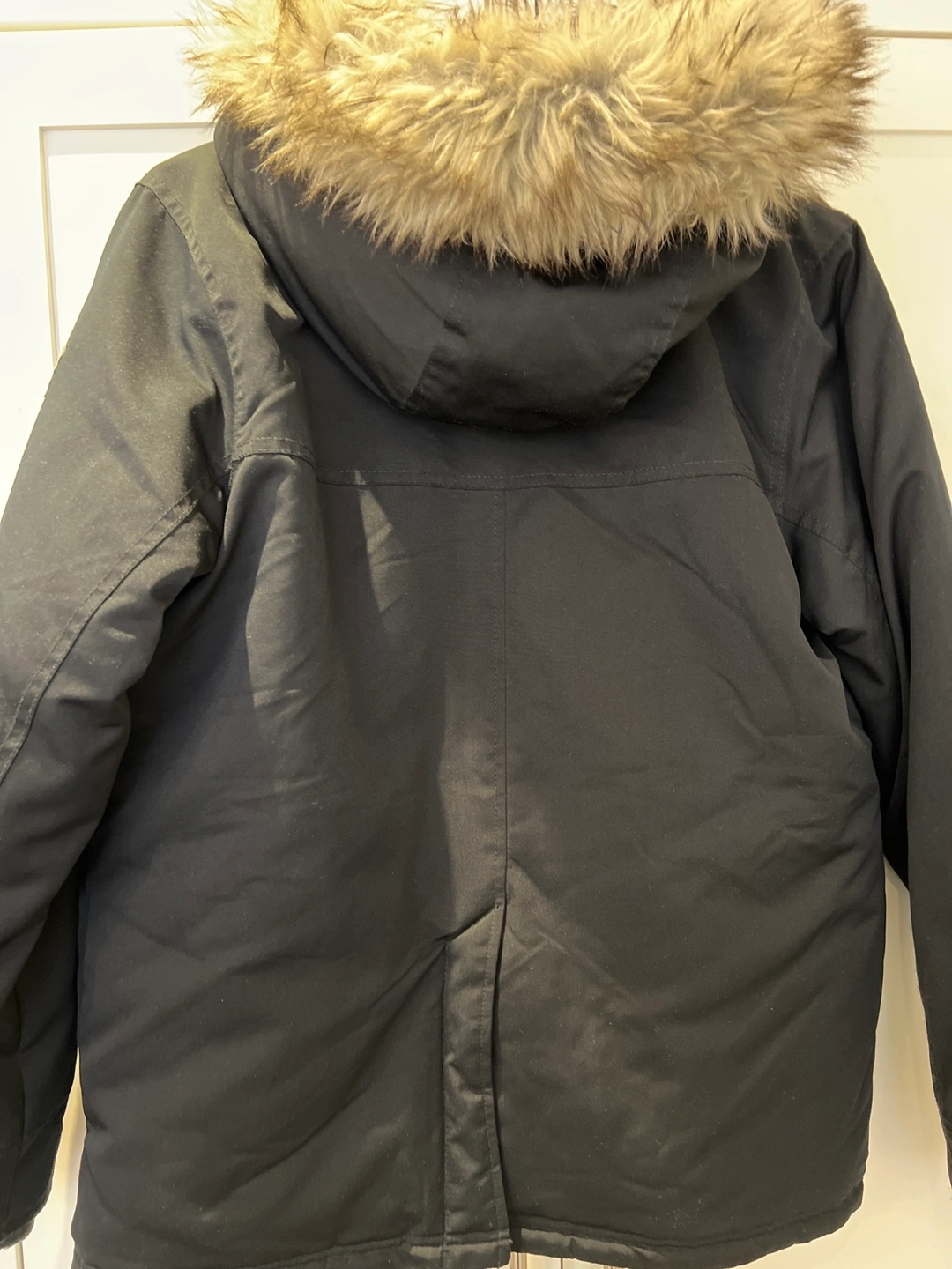 Warm winter jacket. Black colour. Faux fur trim hood. Size 15/16. Pockets. Brand new