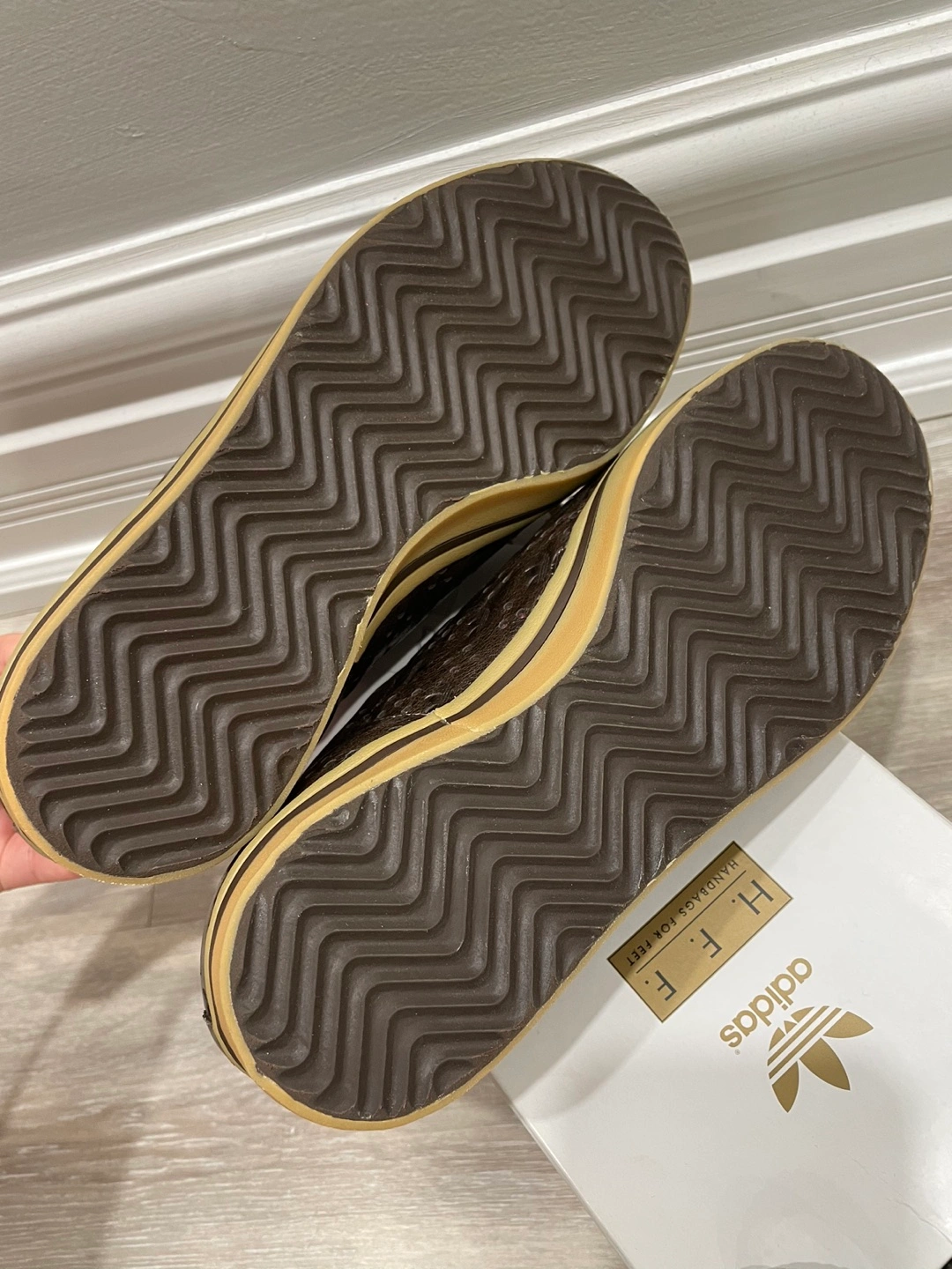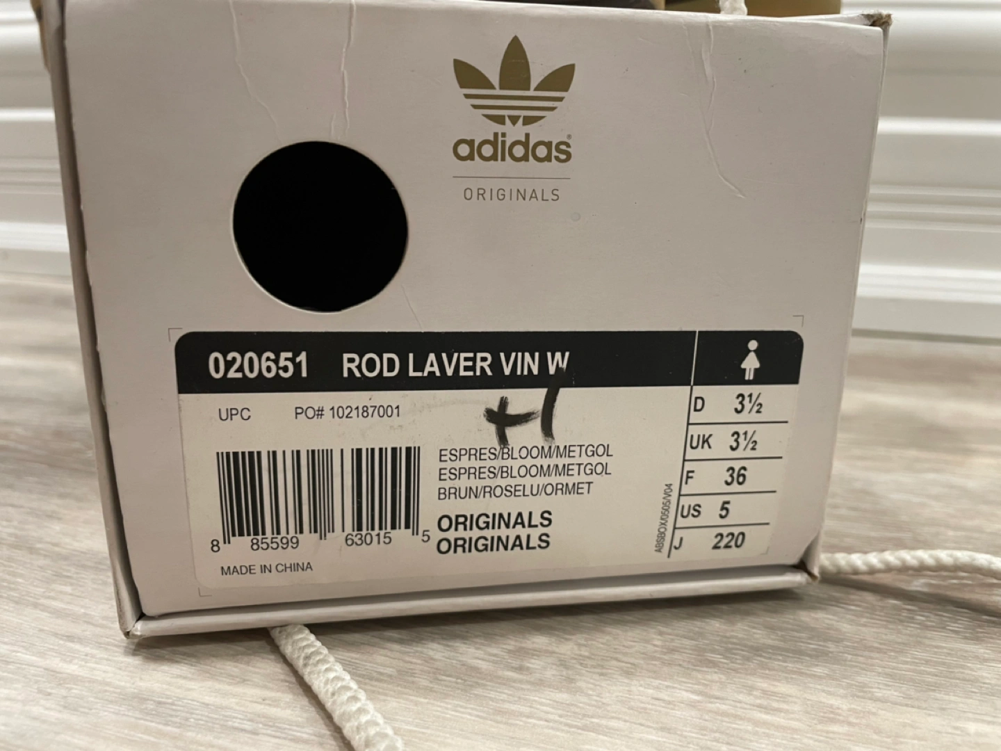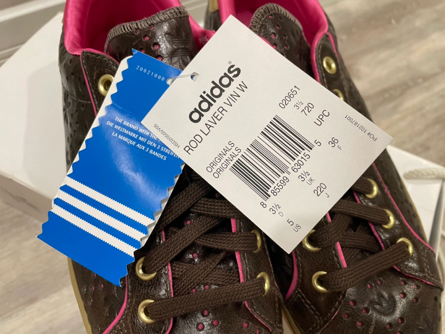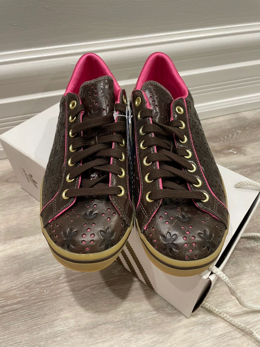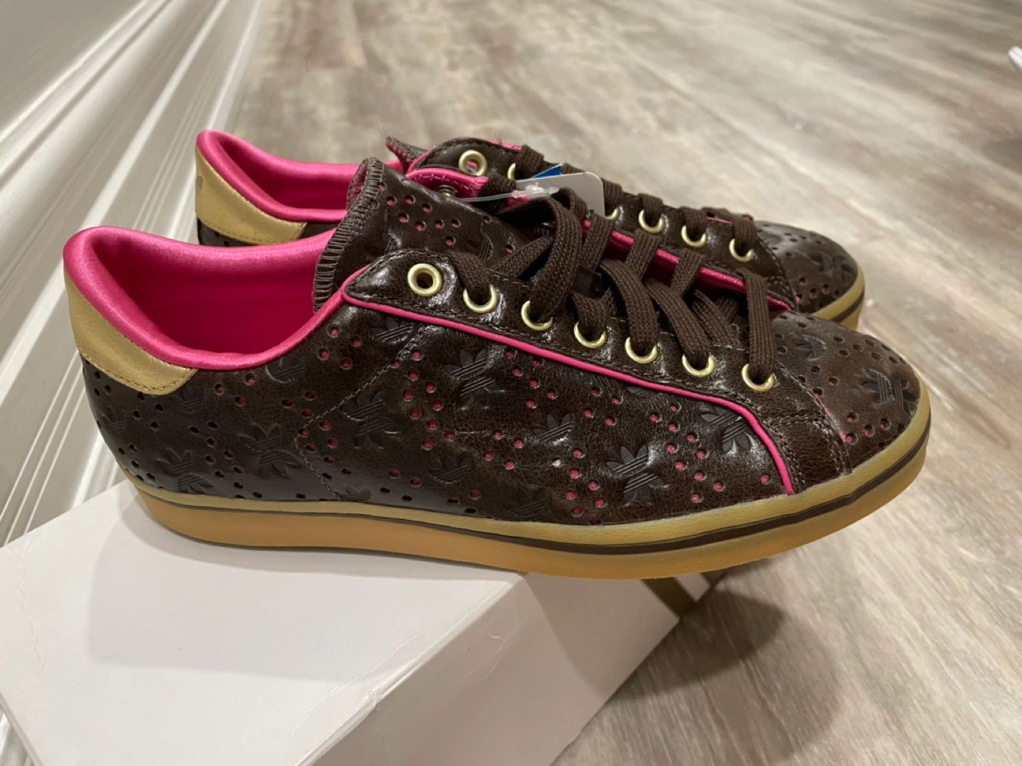 38Adidas women's sneakers vintage. The material is leather. The color is body, dark brown, hot pink on the inner side and gold on the back. This model is not available at all now. Brand new with tag, size 5.