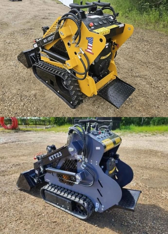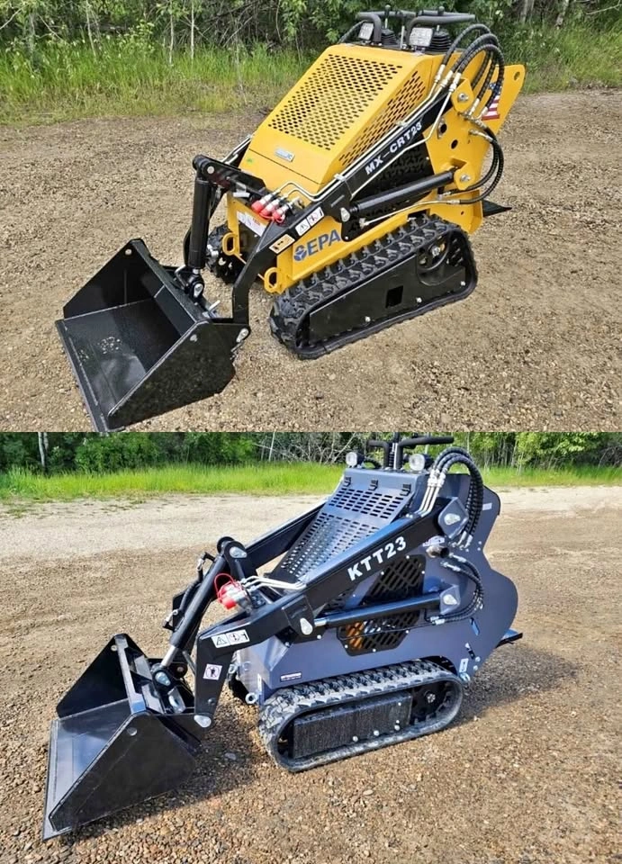 10Brand new mini skid steers for sale. The yellow one is a AGT MX-CRT23, the grey one is a AGT KTT23. Both feature 23HP 739cc Rato V-Twin Gas Engines, 33" Buckets, Auxiliary Hookups, and Folding Platforms. Both can lift over 800lbs and can load dirt and materials directly into a normal dump trailer. The MX-CRT23 is $7499, is 35" wide at the tracks, weighs 1500lbs, and features great ground clearance thanks to it's triangle tracks. The KTT23 is $7999, is 32" wide at the tracks, weighs 2000lbs, and features a shock-absorbing platform. Both machines are fantastic for digging, grading, and moving materials in tight areas, and both can fit through standard gates and doors. Both machines can run a wide variety of attachments, which I also have available for purchase, or operate as a mobile hydraulic power pack. Don't need a narrow unit? I also have 41" wide units, 24HP Arteer QB480 for $6499 and 23HP 3 Pump AGT CRT23 for $7899. Pickup West Lethbridge. Message me for a list of attachments and prices. I have Grapples, Augers, Trenchers, Tillers, and More!