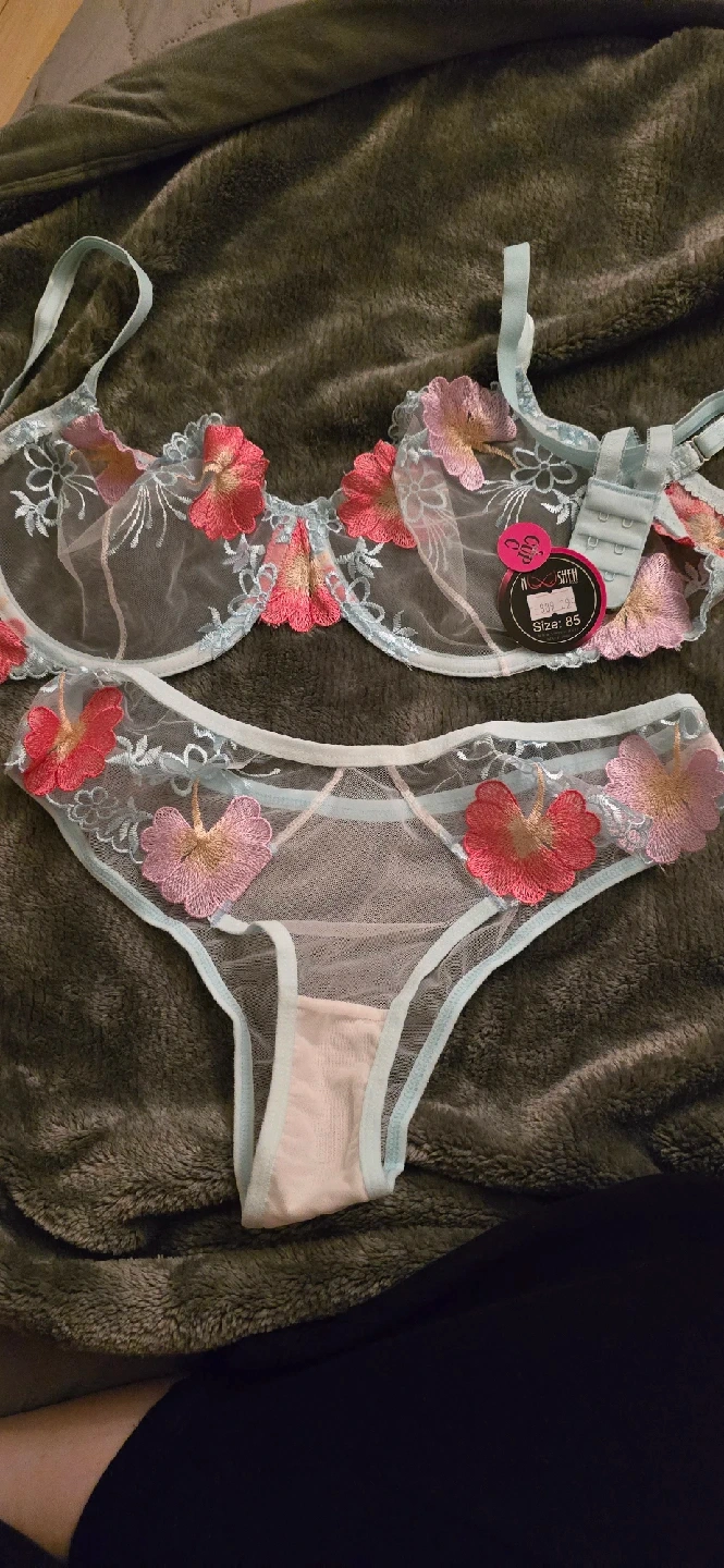 60Selling a brand new lingerie set from Aoshen. It's a beautiful light blue colour with floral embroidery. The size is 85.