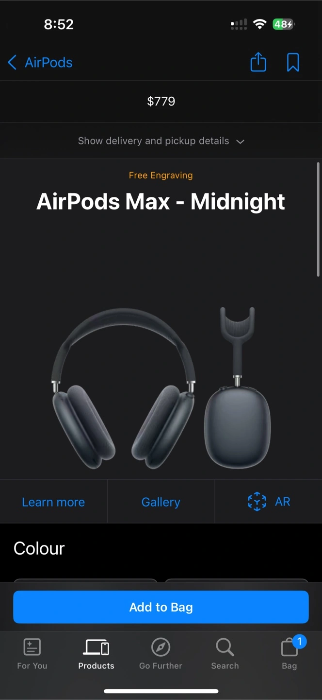 Selling a brand new pair of Apple AirPods Max in Midnight! They come with all original components and packaging. These headphones retail for $779. Enjoy premium audio quality and noise cancellation with these stylish headphones I am selling it for 450$ I already got one so selling this one it has just little scratch might be like some sand grain sized one
