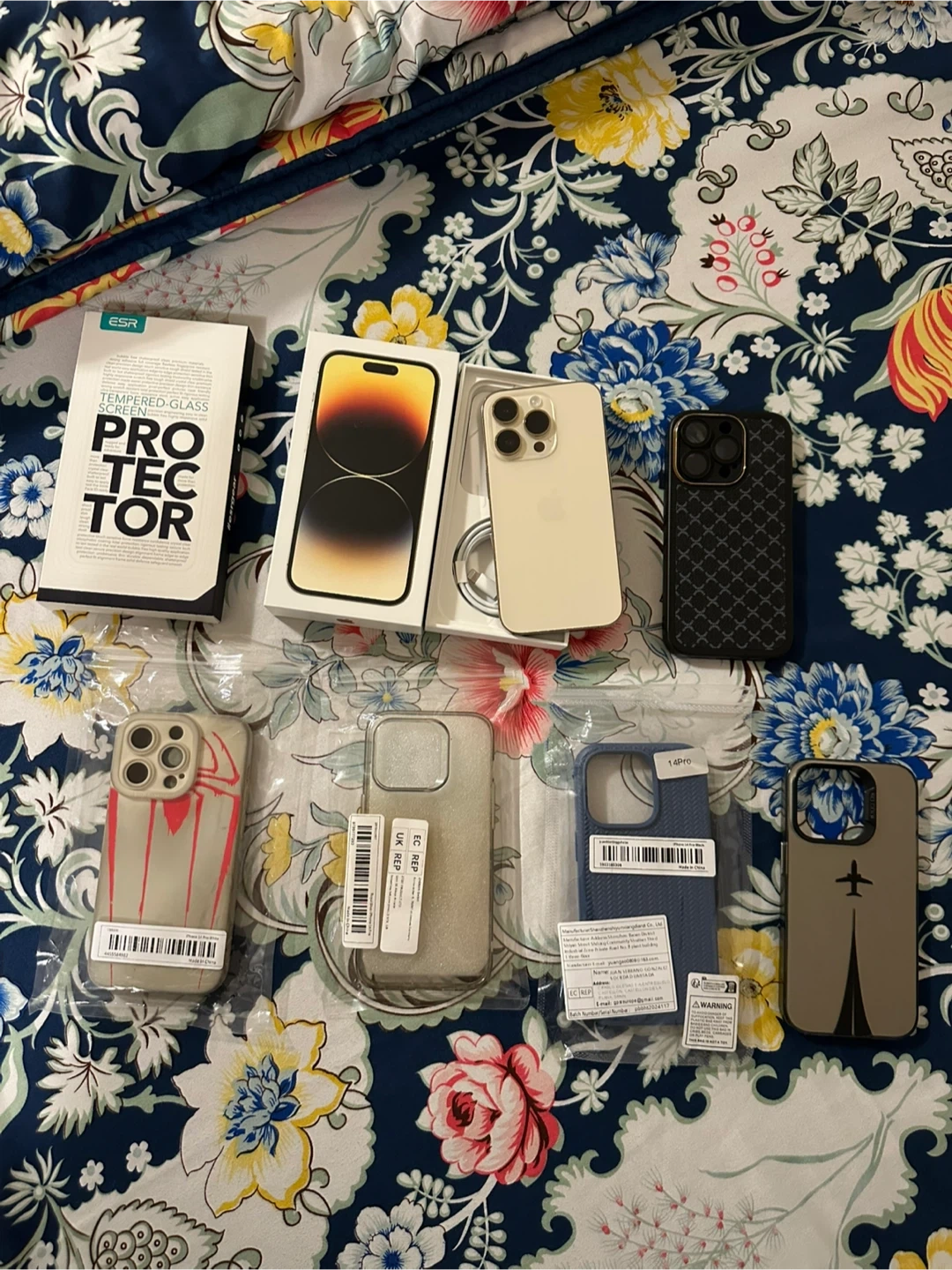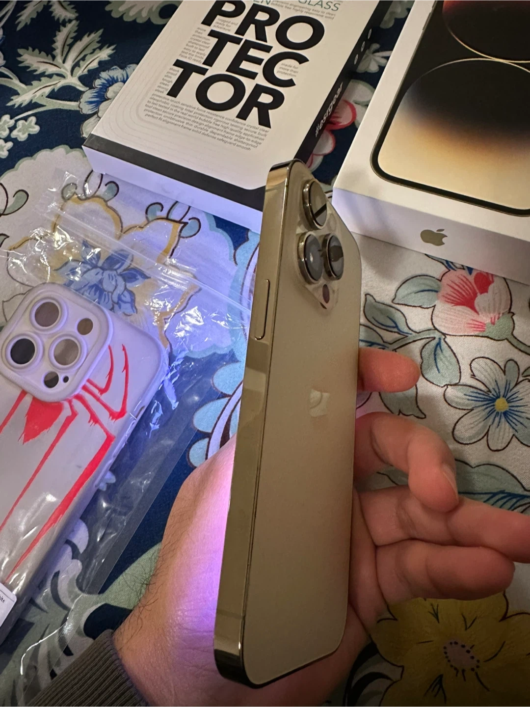 Selling an iPhone 14 Pro in Gold 128GB with screen protector installed! It comes with several brand new phone cases and a brand new 2 screen protector with complete installation kit as well. The box is included and seal packed charging cable as well. All the accessories are worth more than $150+ itself. Not even a single scratch or dent, you won’t find such a flawless condition used iPhone 14 pro I guarantee. Battery health 85%, still easily lasts for a whole day.