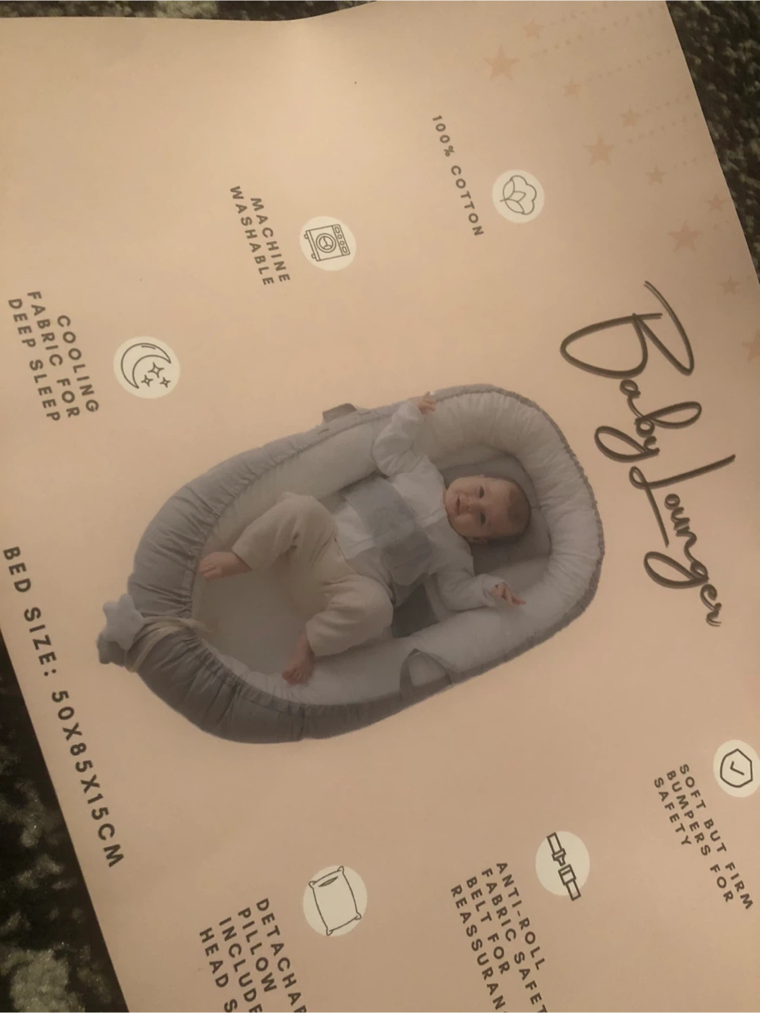 595Selling a brand new baby lounger! It's made of 100% cotton and has a cooling fabric for deep sleep. It's also machine washable. The bed size is 50x85x15cm and features soft but firm bumpers for safety. Includes anti-roll fabric safety belt foam for reassurance and a detachable pillow to include head support