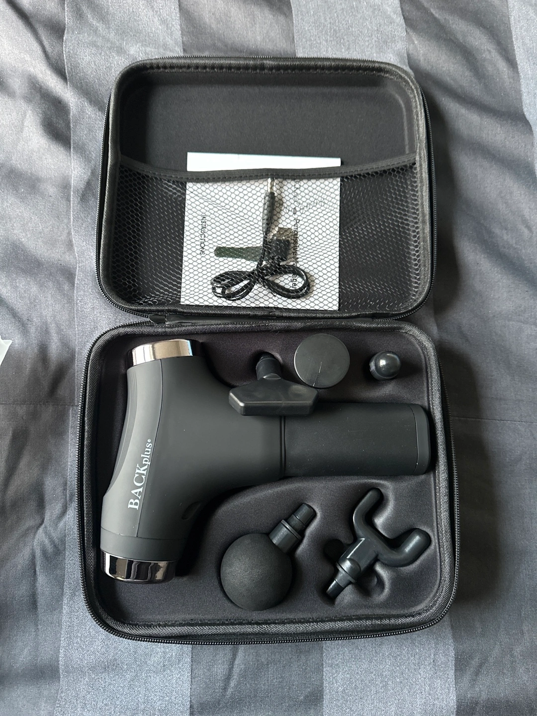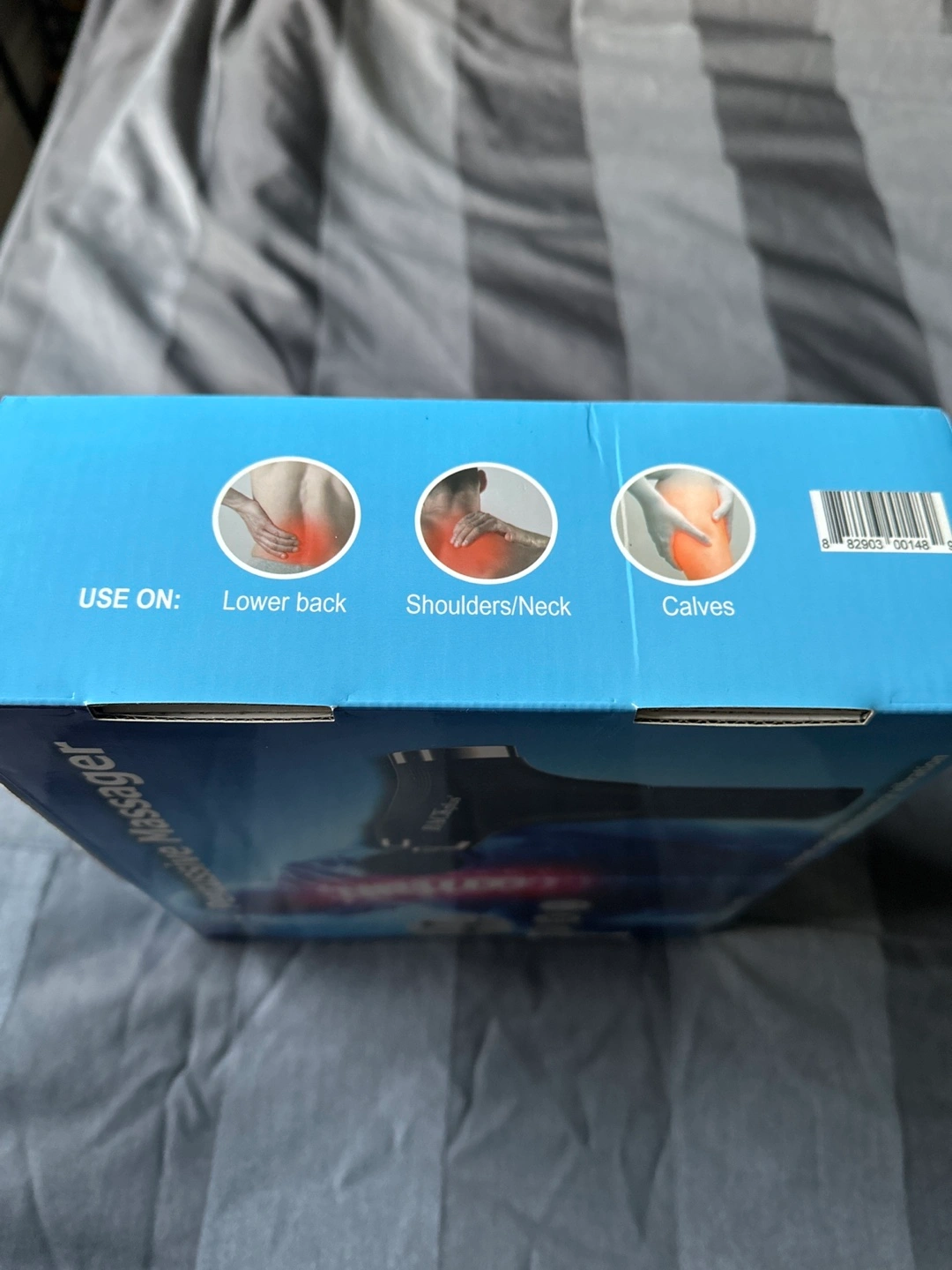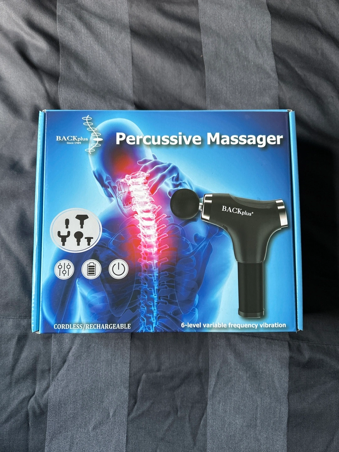 Cordless and rechargeable percussive massager. Six-level variable frequency vibration. Great for lower back, shoulders/neck, and calves. Aids in relieving muscle soreness and fatigue. Condition: NEW Includes: - 5 different attachments - Carrying case - Instructions - Charger *Cash Only*