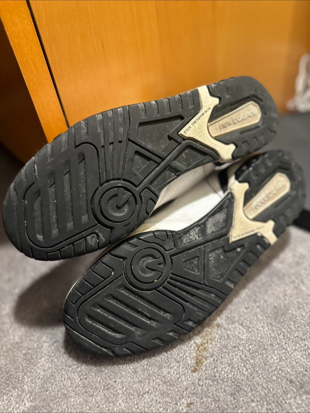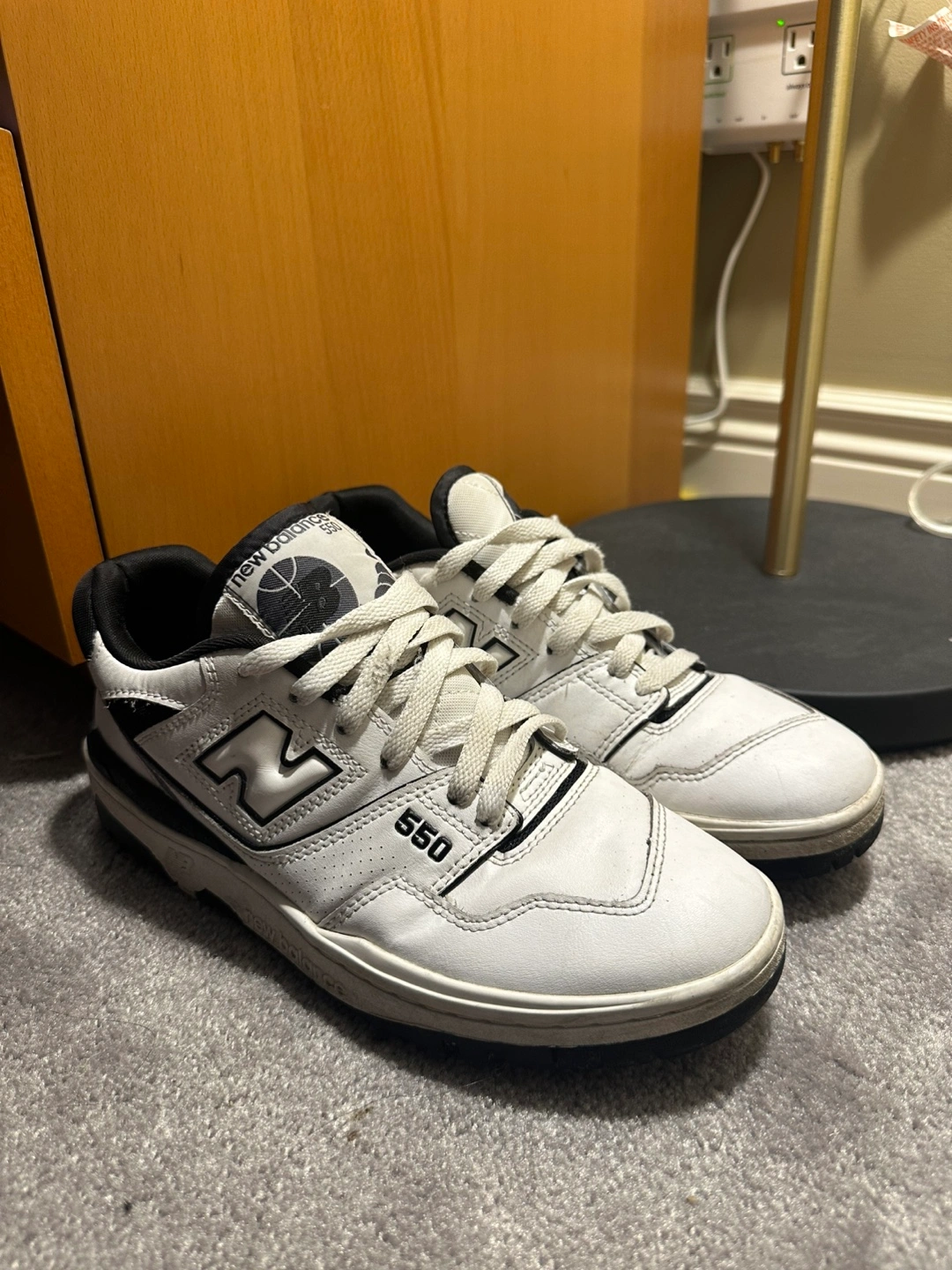 43Pre-owned New Balance 550 sneakers. White leather upper, black accents. Women's size 9.5 / Men’s size 8. Good condition.