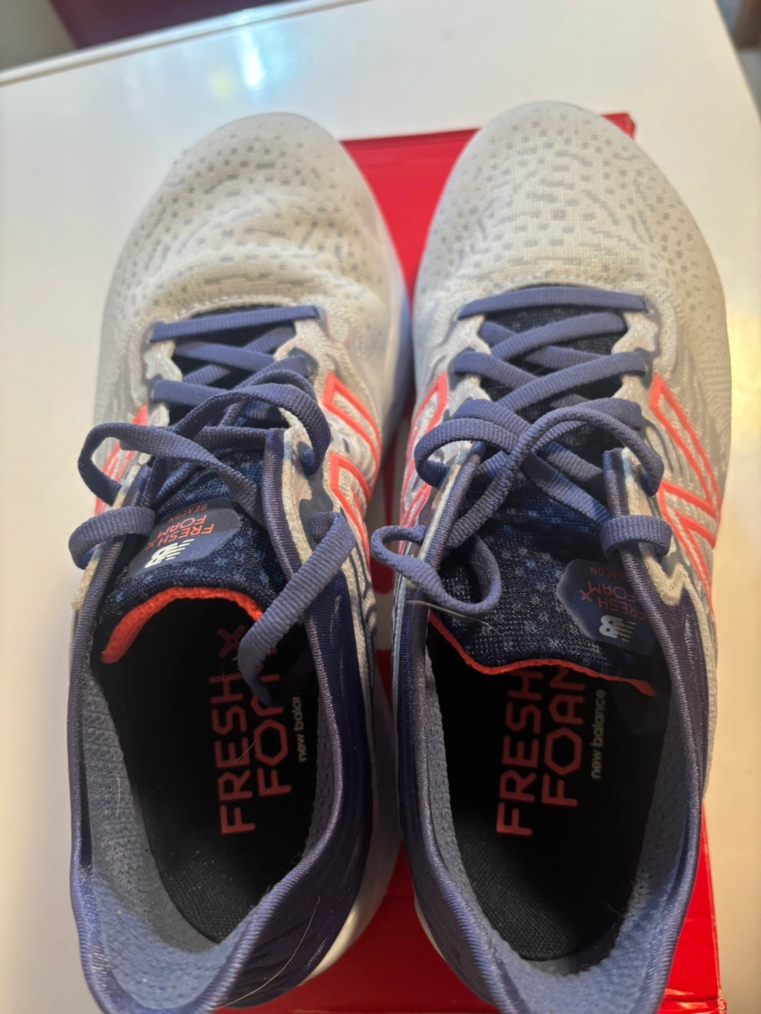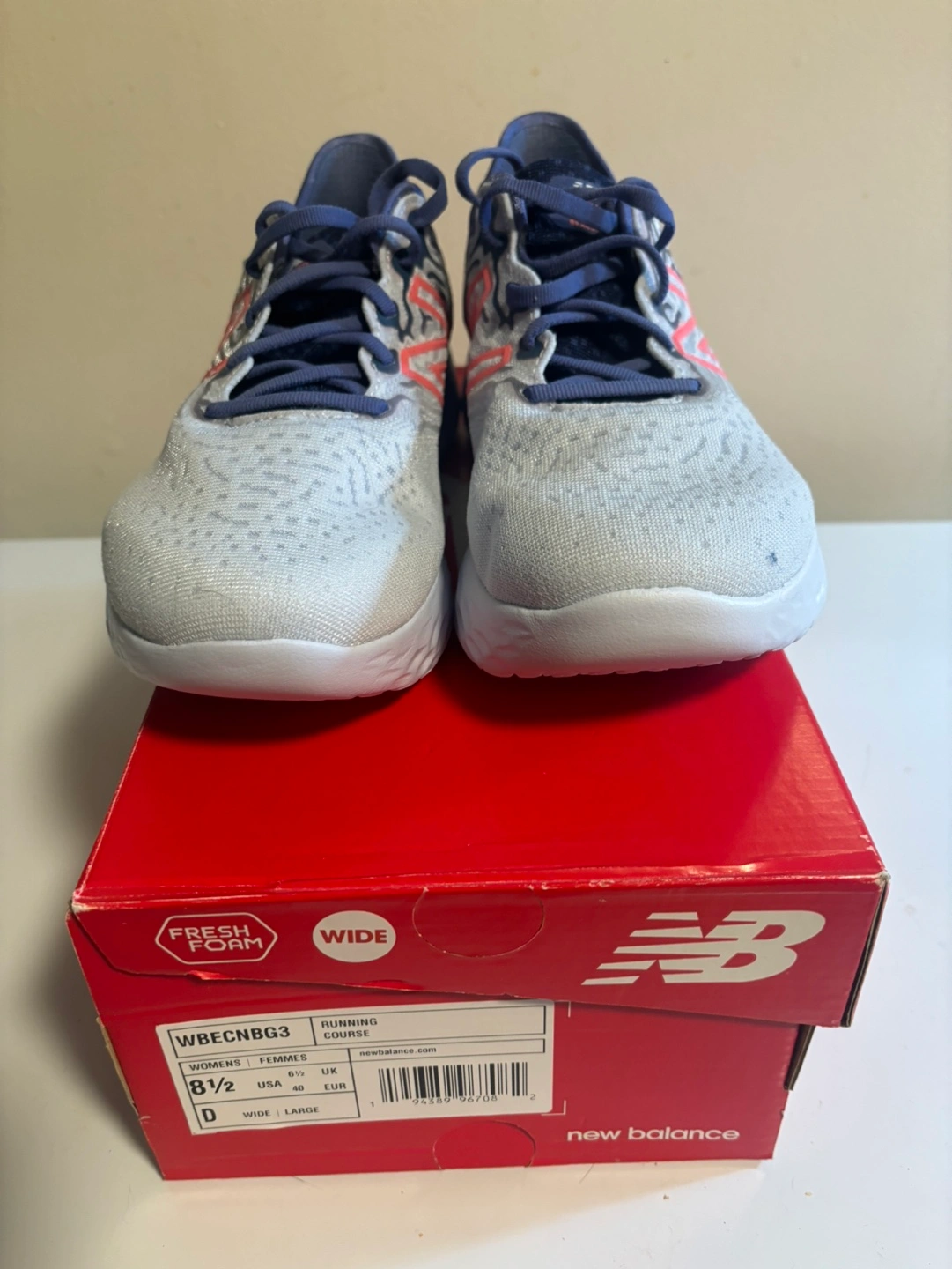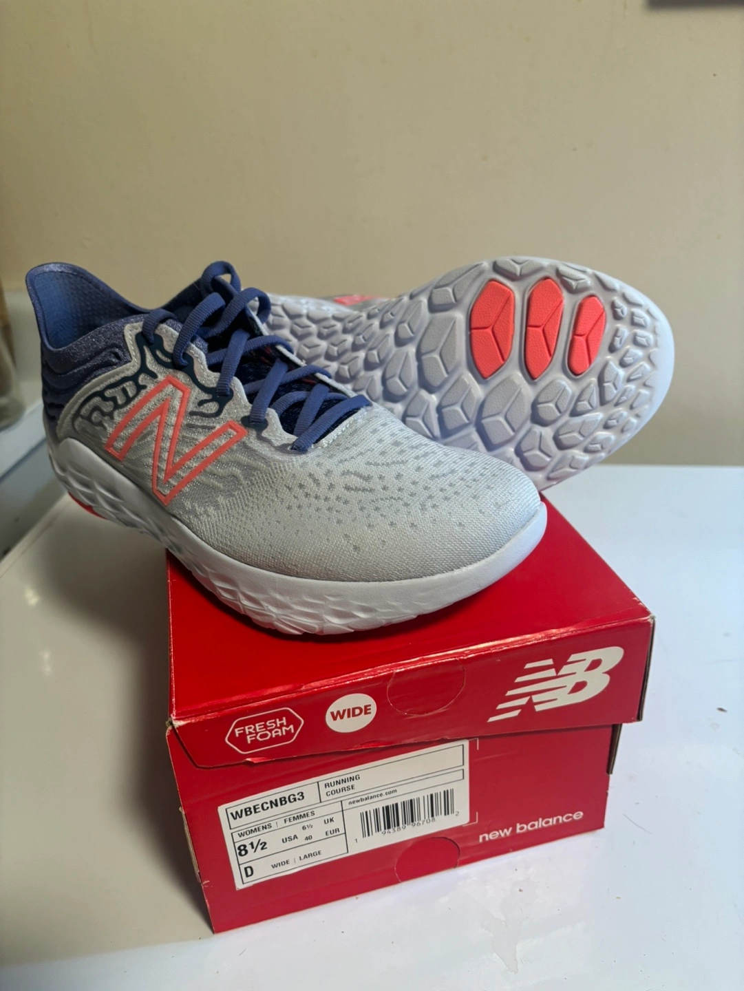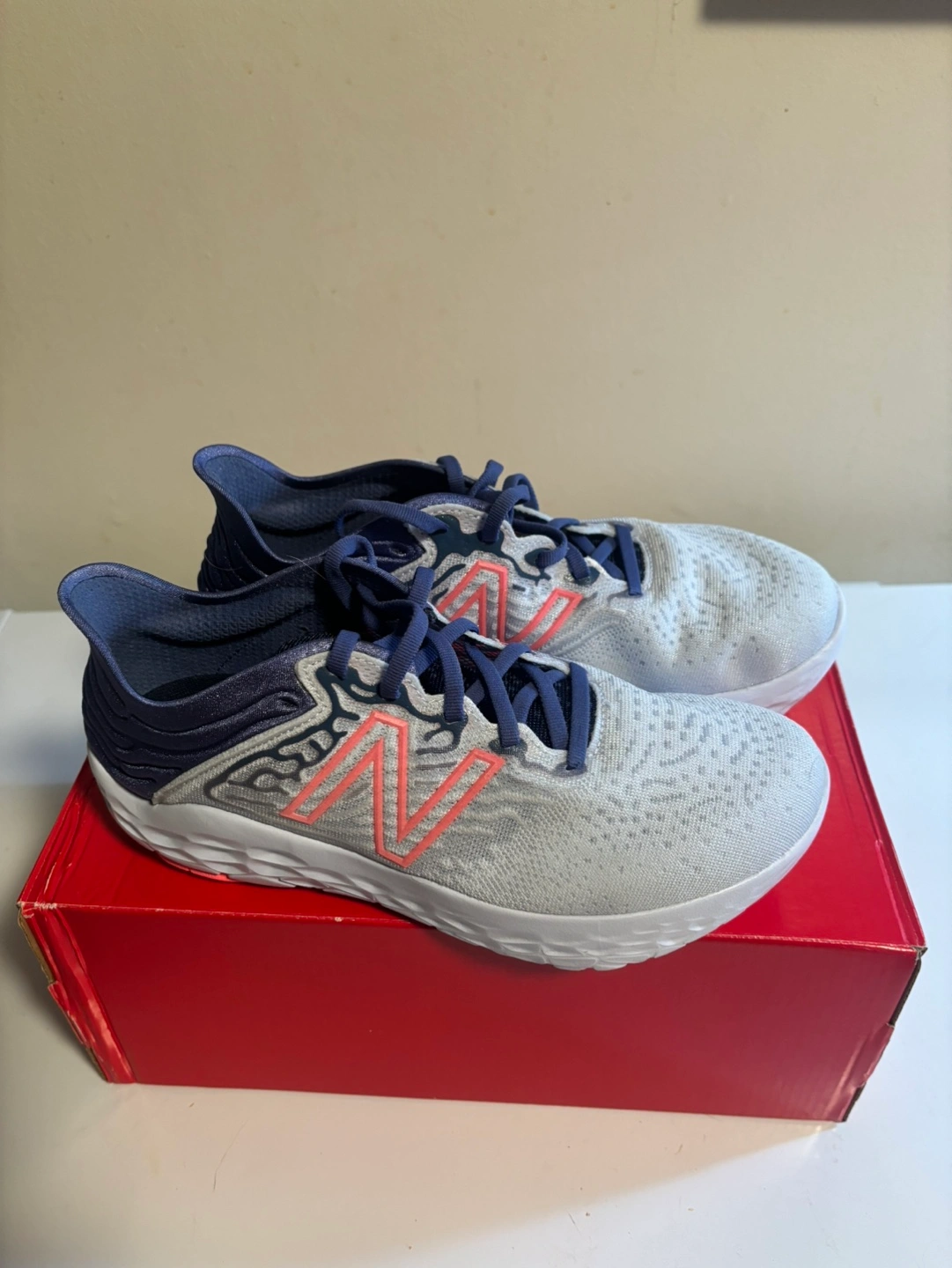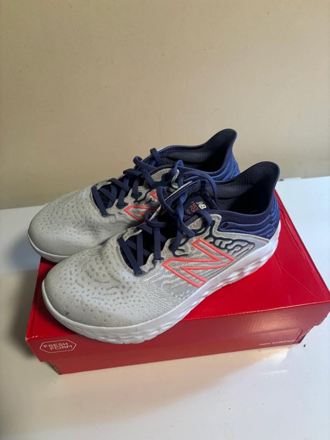 New Balance running shoes, grey and blue with pink accents. Fresh Foam. Never worn. Brand new in the box.
