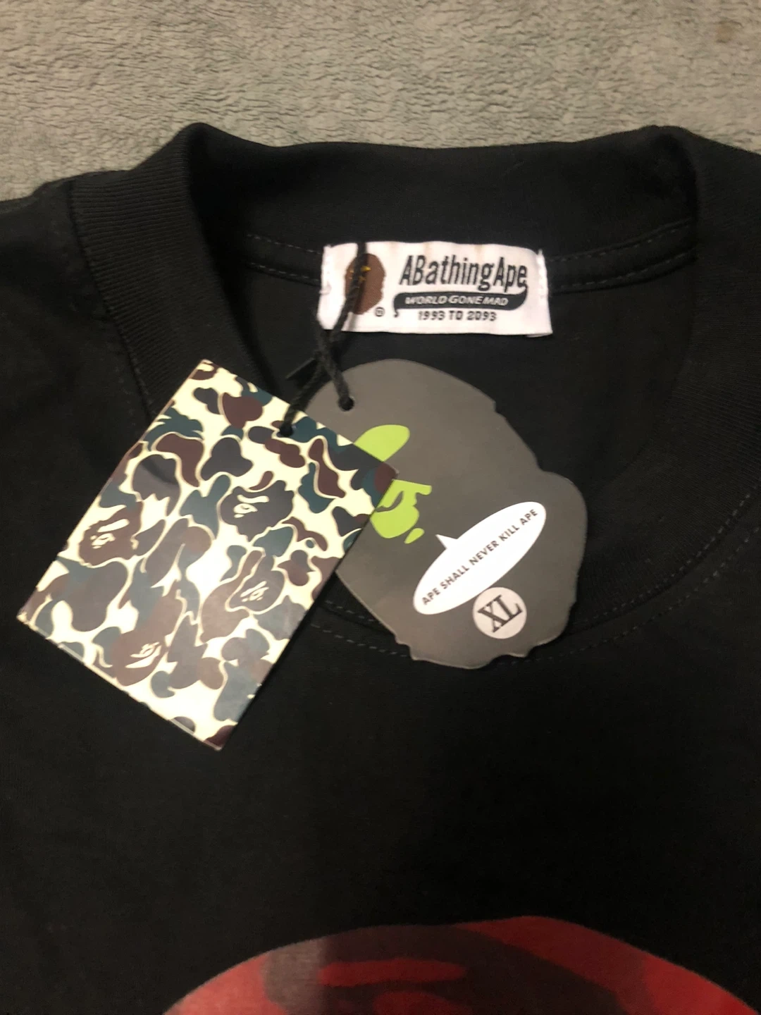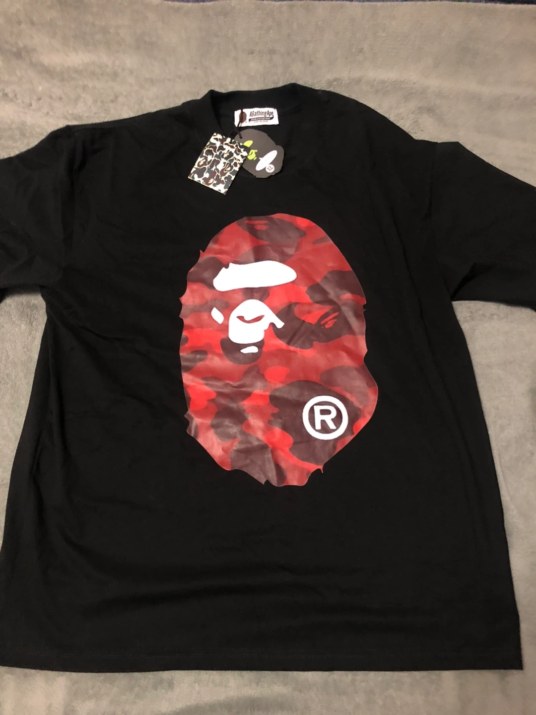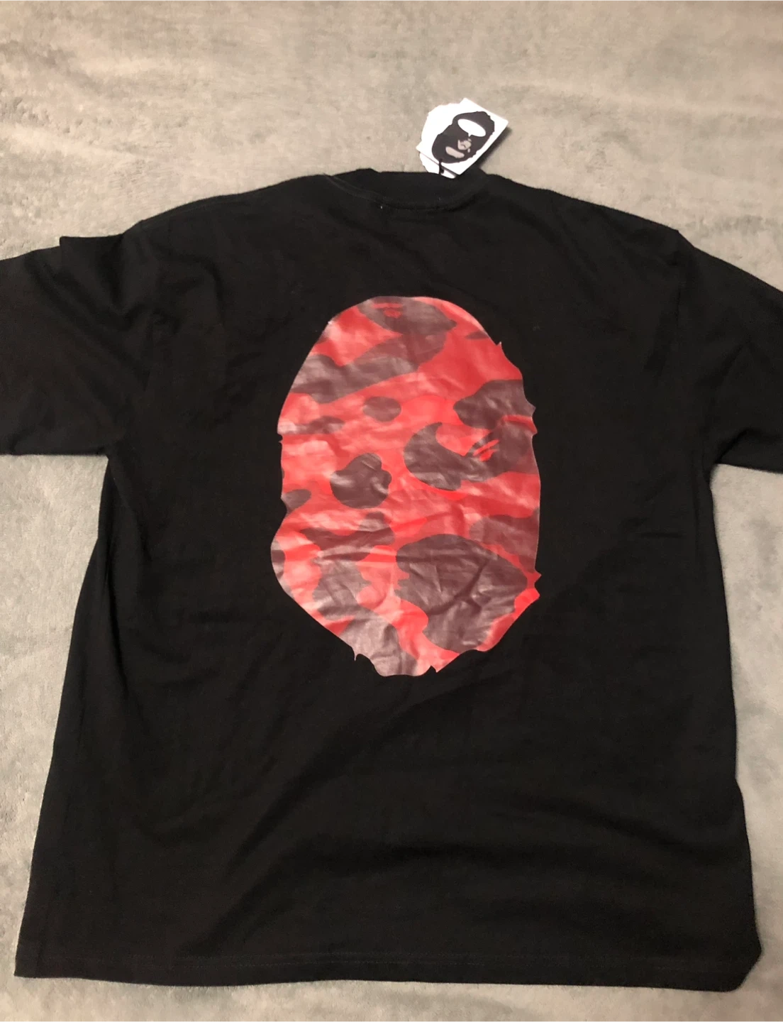 15I'm selling a brand new BAPE (A Bathing Ape) t-shirt. It's black with a red camo design on the front and back. The size is XL.