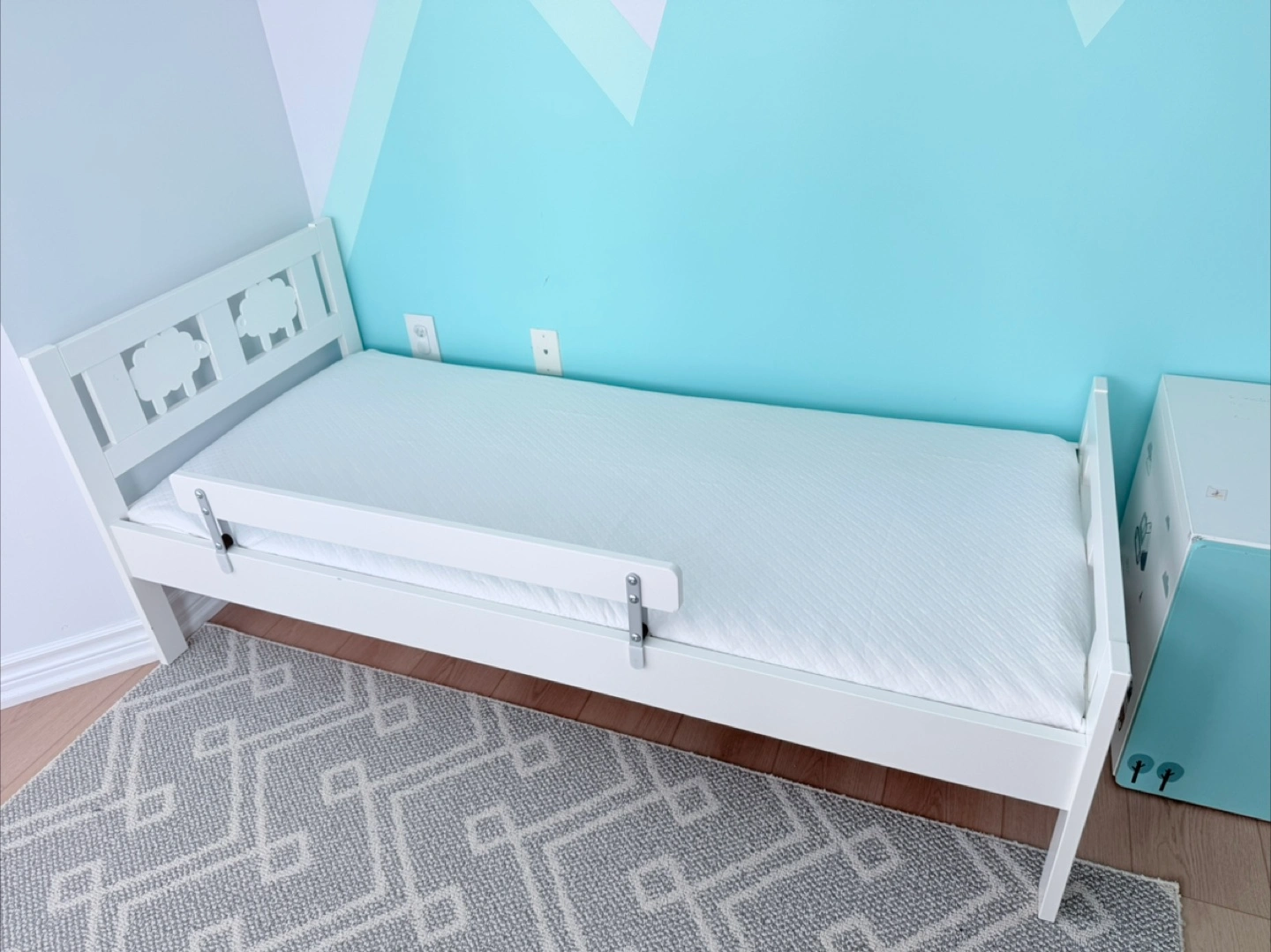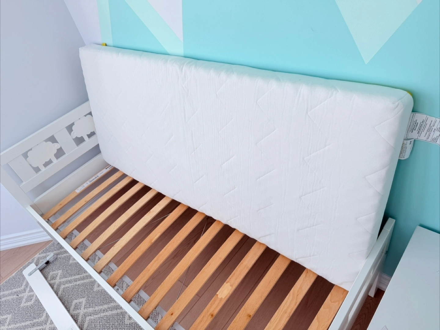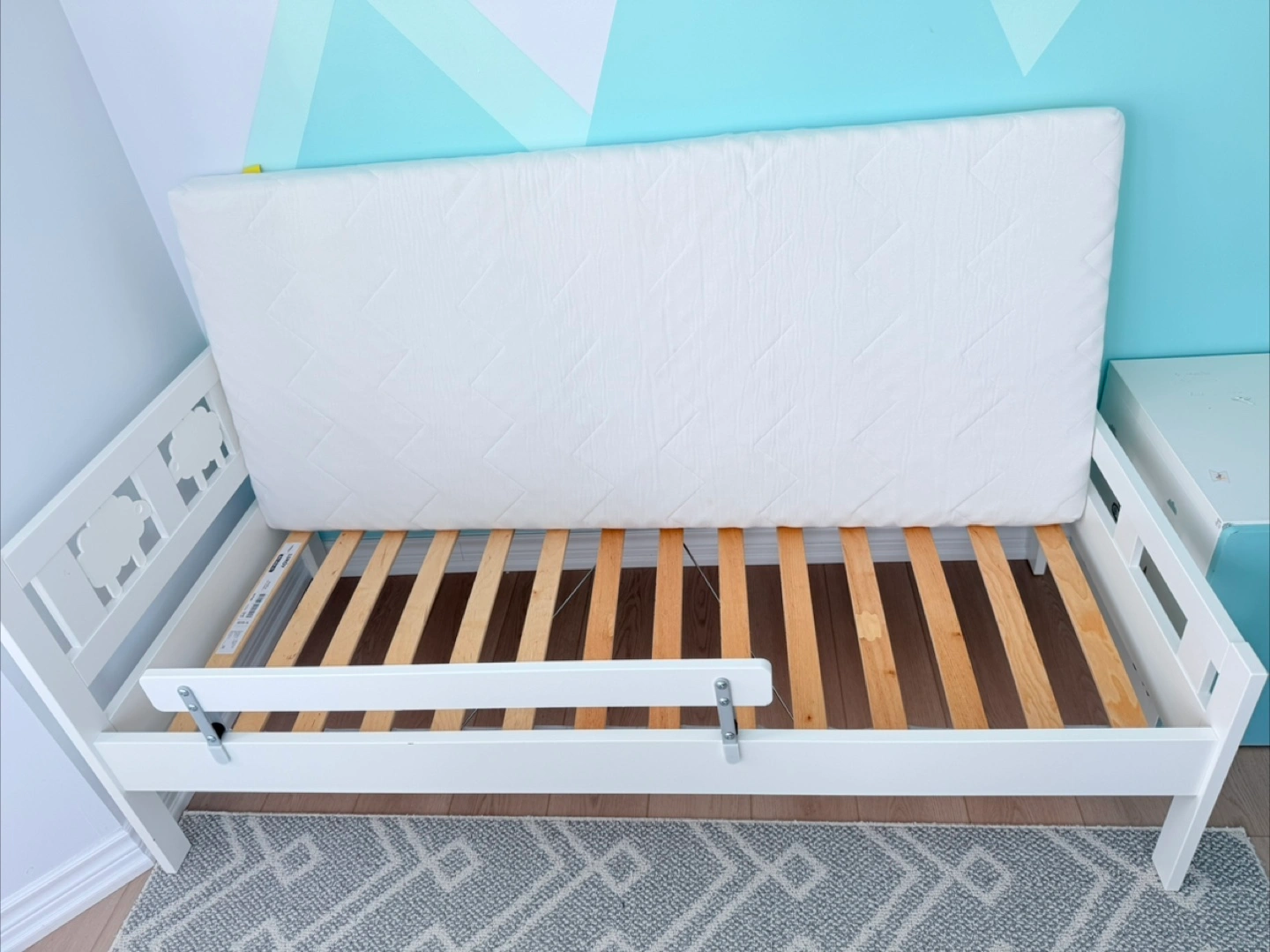 New IKEA Bed for Kids Assembled but never slept in. Includes never slept in IKEA mattress designed for this bed KRITTER bed frame with slatted bed base for good air circulation, white, 70x160 cm (27 1/2x63 ") Let the sheep guard your little kid’s dreams while the removable guardrail prevents them from falling out of the bed Velue: $300 + Tax