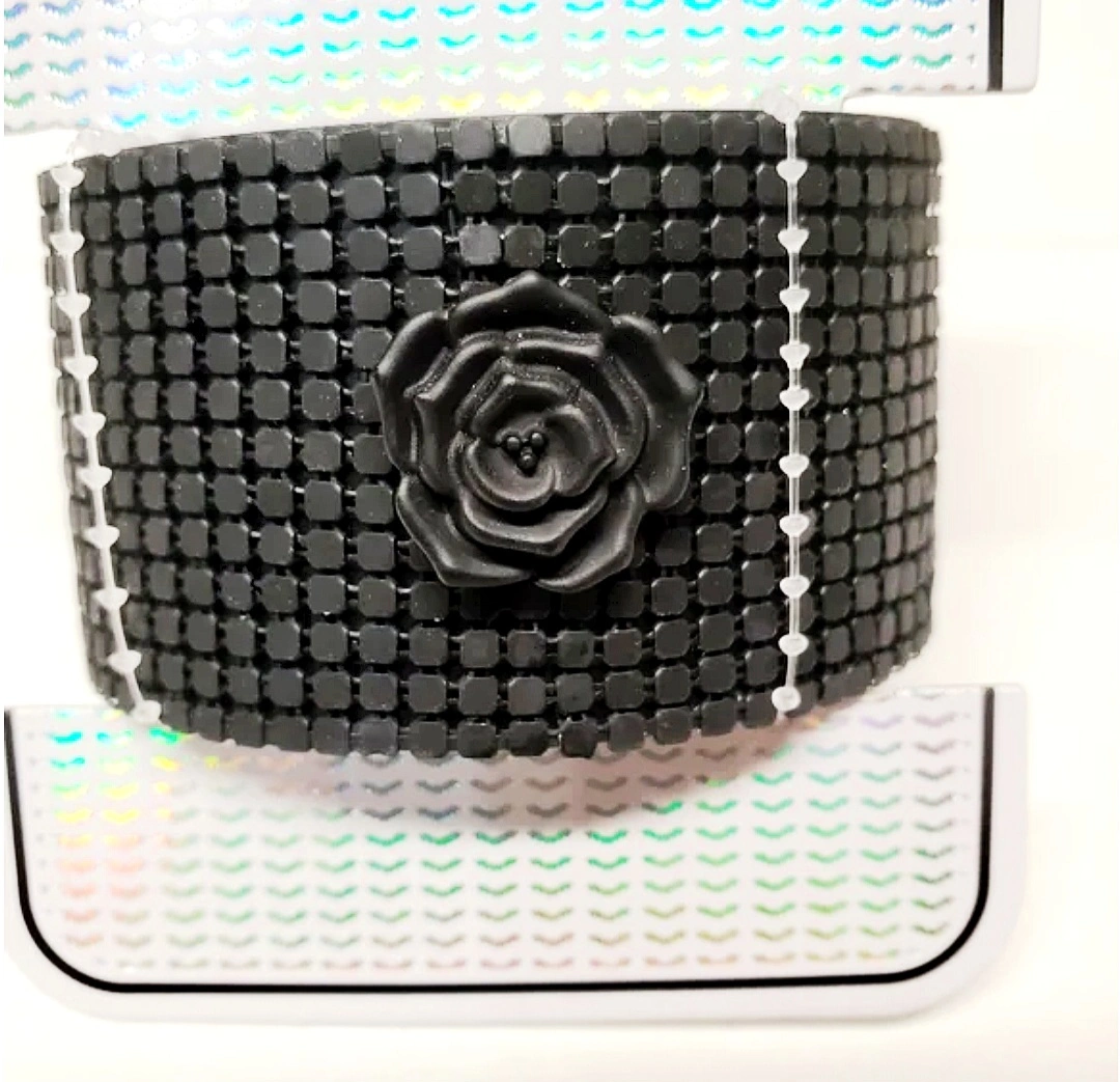 New Black Cuff Bracelet with Rose Make a statement with this stylish black cuff bracelet, featuring a beautiful rose centerpiece that adds a touch of romance and sophistication. Sleek black cuff design for a bold, modern look. Rose in the centre for an elegant, feminine touch. Comfortable fit — perfect for casual or dressy outfits. A stunning accessory for any occasion.