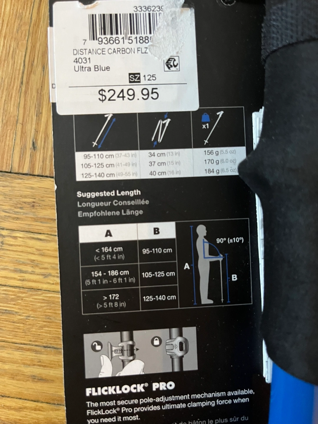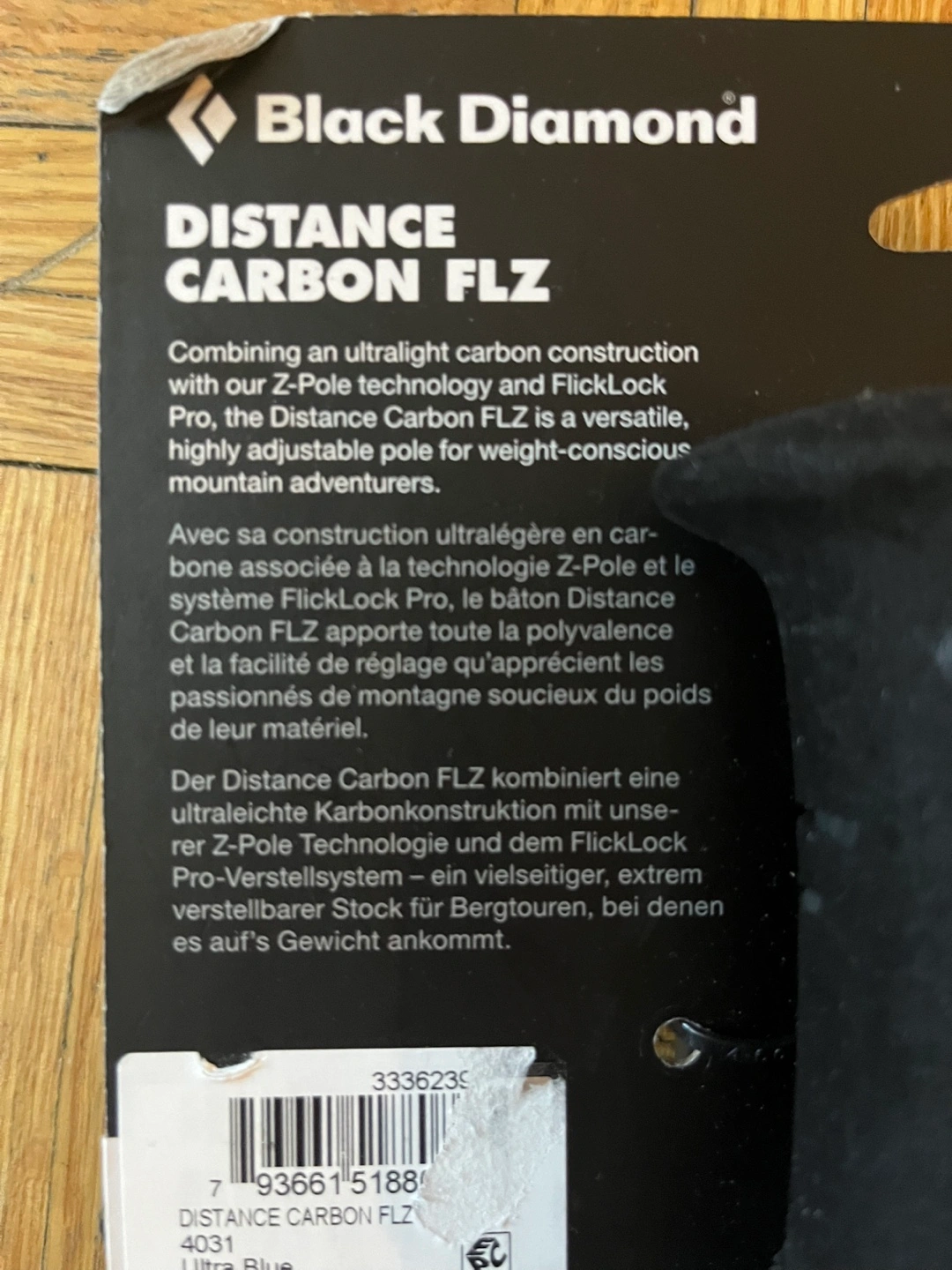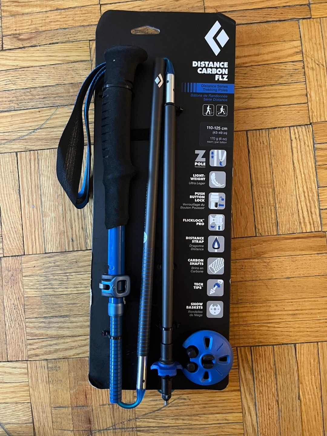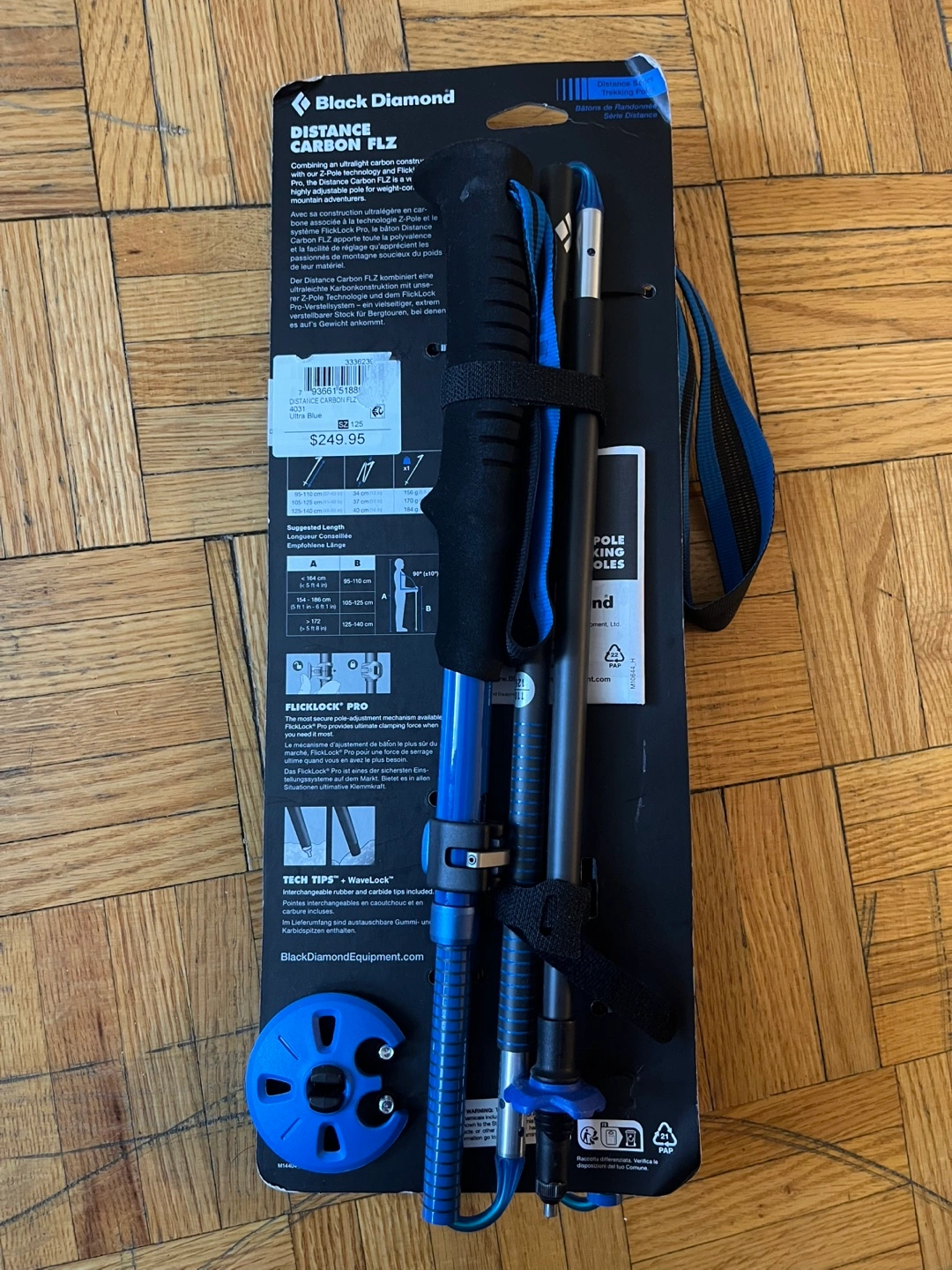 Selling a brand new pair of Black Diamond Distance Carbon FLZ trekking poles! These are the Distance Series Trekking Poles, size 110-125 cm (43-49 in). They're super lightweight, each pole is only 170 g (6 oz). They feature Z-Pole technology, FlickLock Pro adjustability, and carbon shafts. Originally bought for $249.95