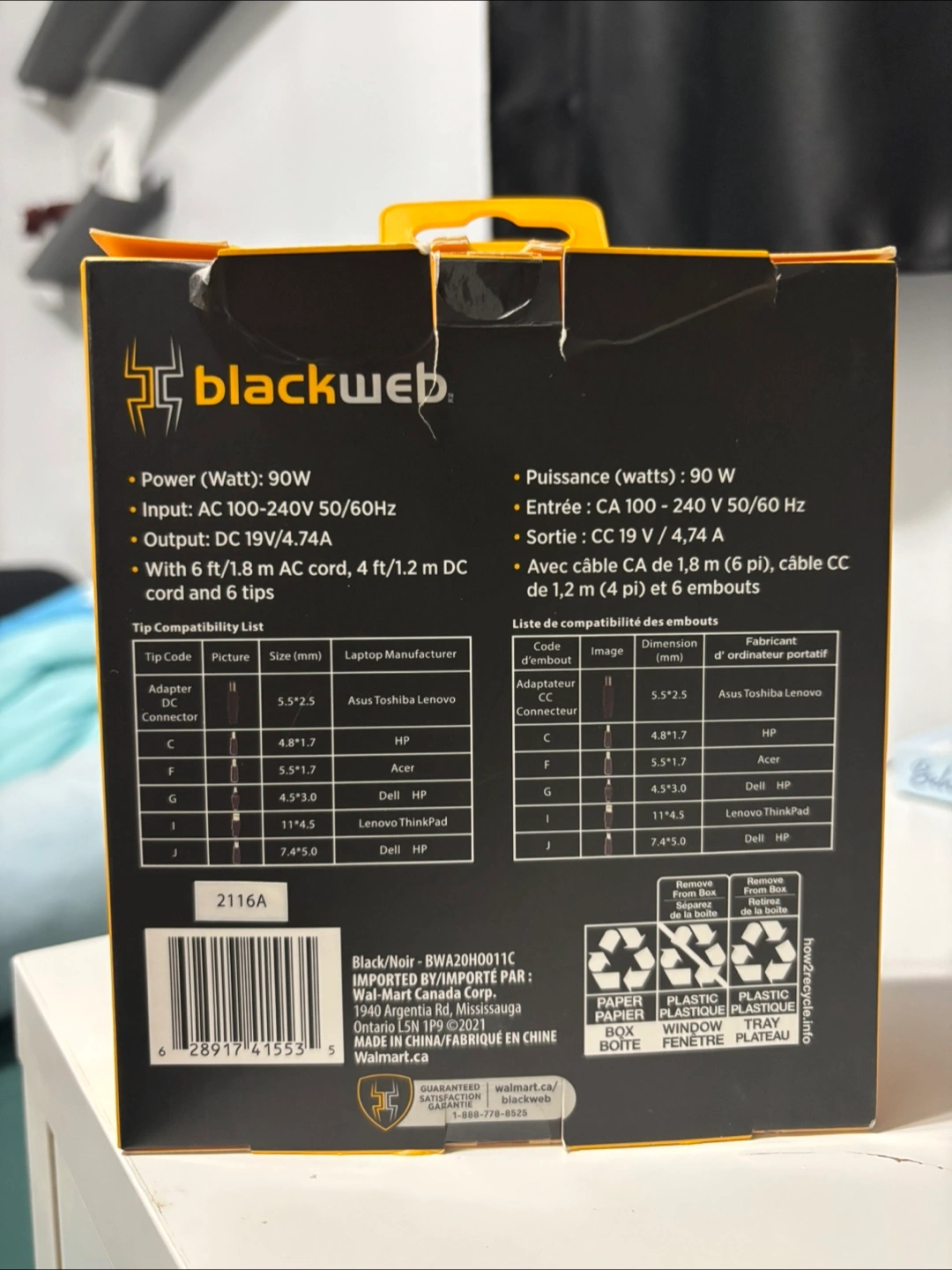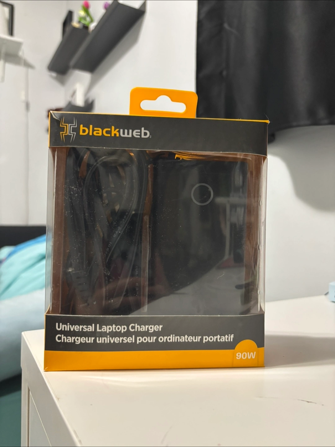 Selling a brand new Blackweb Universal Laptop Charger, still in its original packaging! This 90W charger is compatible with a variety of laptops. It includes a 6 ft/1.8 m AC cord, 4 ft/1.2 m DC cord, and 6 tips. The box is included!