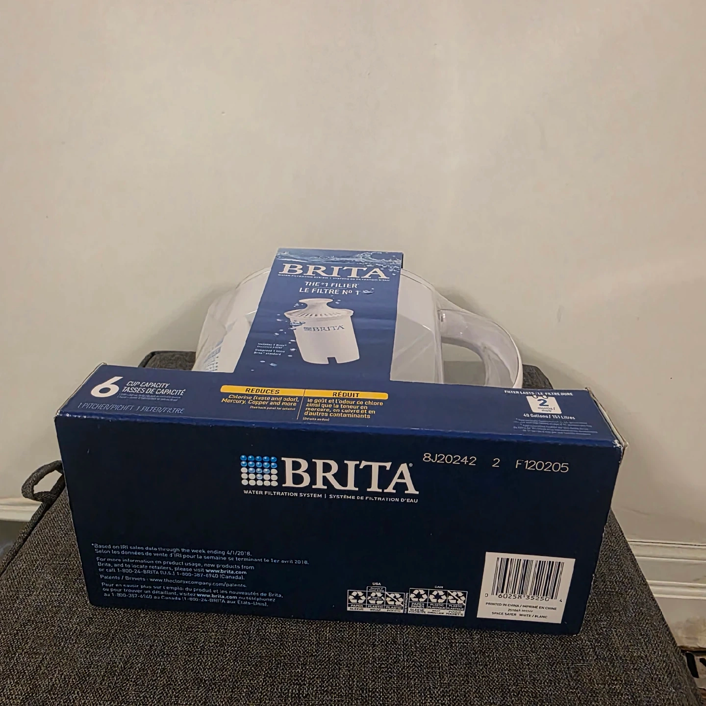 10I'm selling a brand new Brita water filtration pitcher! It's still in its original packaging and ready to use. This pitcher helps reduce chlorine taste and odour, as well as other impurities, giving you cleaner, great-tasting water. It has a 6-cup capacity and comes with one filter that can replace up to 300 water bottles