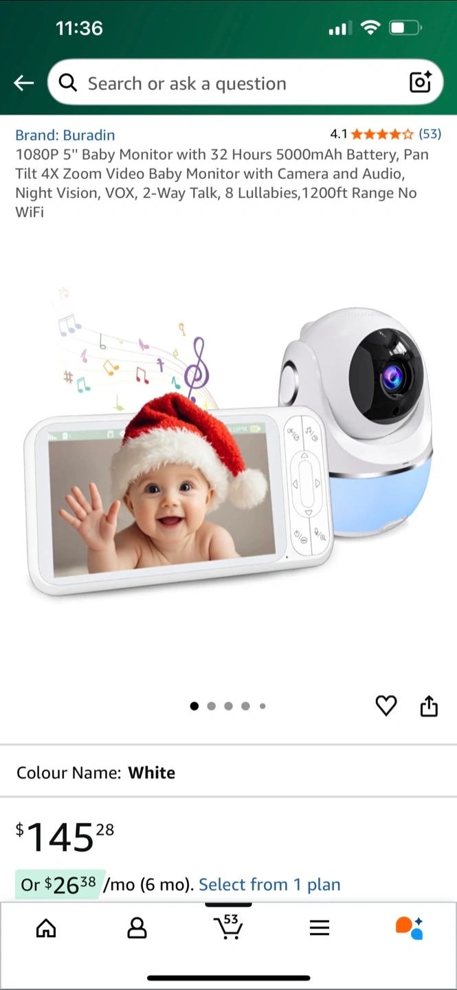 126Selling a brand new open box Buradin baby monitor! It's still in its original packaging and has never been used. Key features include: - 1080P resolution - 5" display - 32 hours of battery life - Pan, tilt, and 4x zoom - Includes camera and audio, night vision, VOX, 2-way talk, 8 lullabies, and a 1200ft range The original price was $145.28 Brand new open box (just checked) Received as a gift and opened the box for comparison for the other monitor i received This is no wifi for privacy Pick up only: lakeshore and royal york