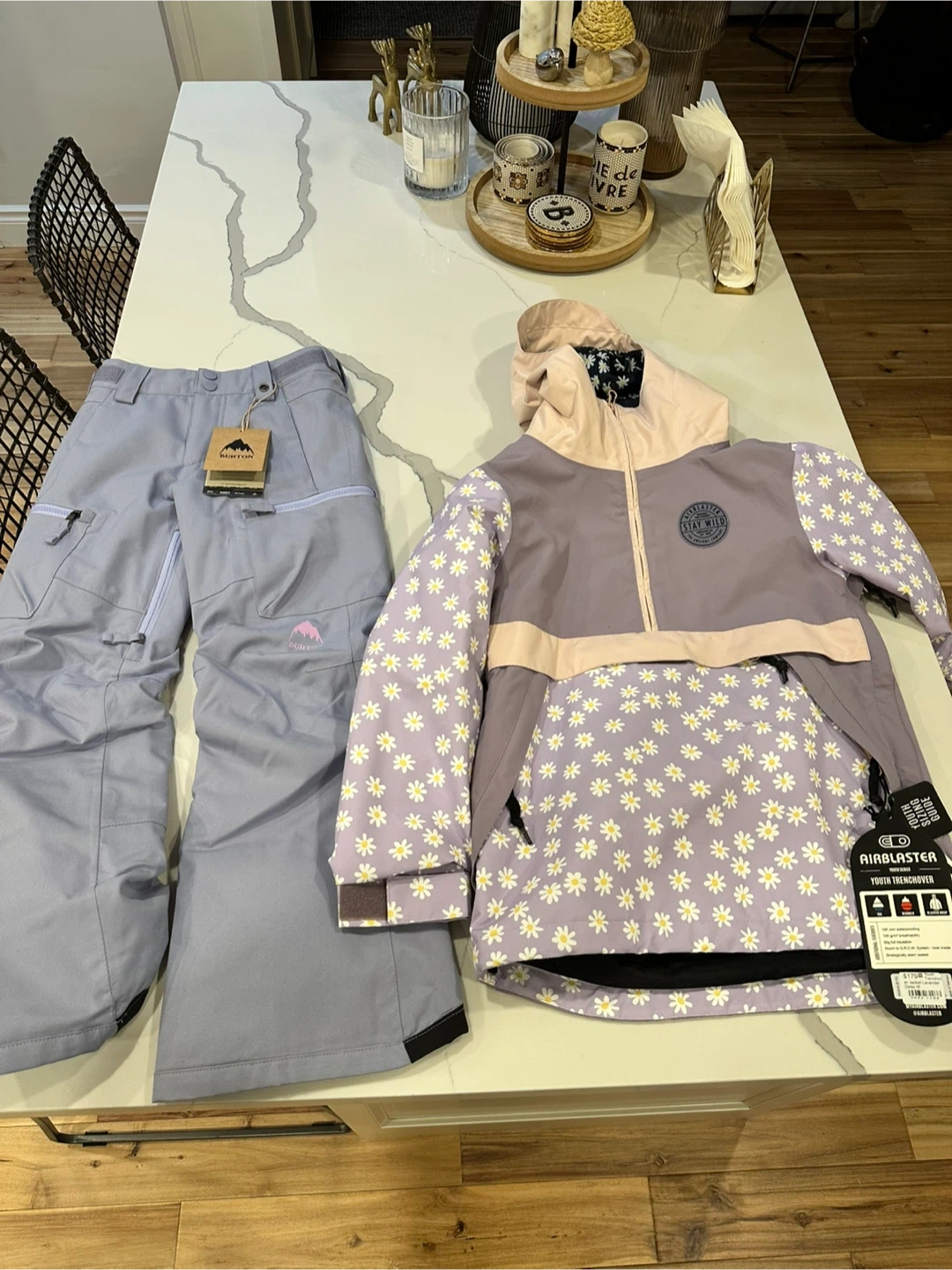 23Selling a brand new set of snow gear! The Burton G Elite Cargo PT snow pants are a size small and the colour is Foxglove Violet. Originally bought for $149.99 CAD. The Airblaster Youth Trenchover is a size medium and features a cute daisy print. It has 10K mm waterproofing and 10K g/m² breathability. It also has 60g full insulation and a Room to G.R.O.W. System