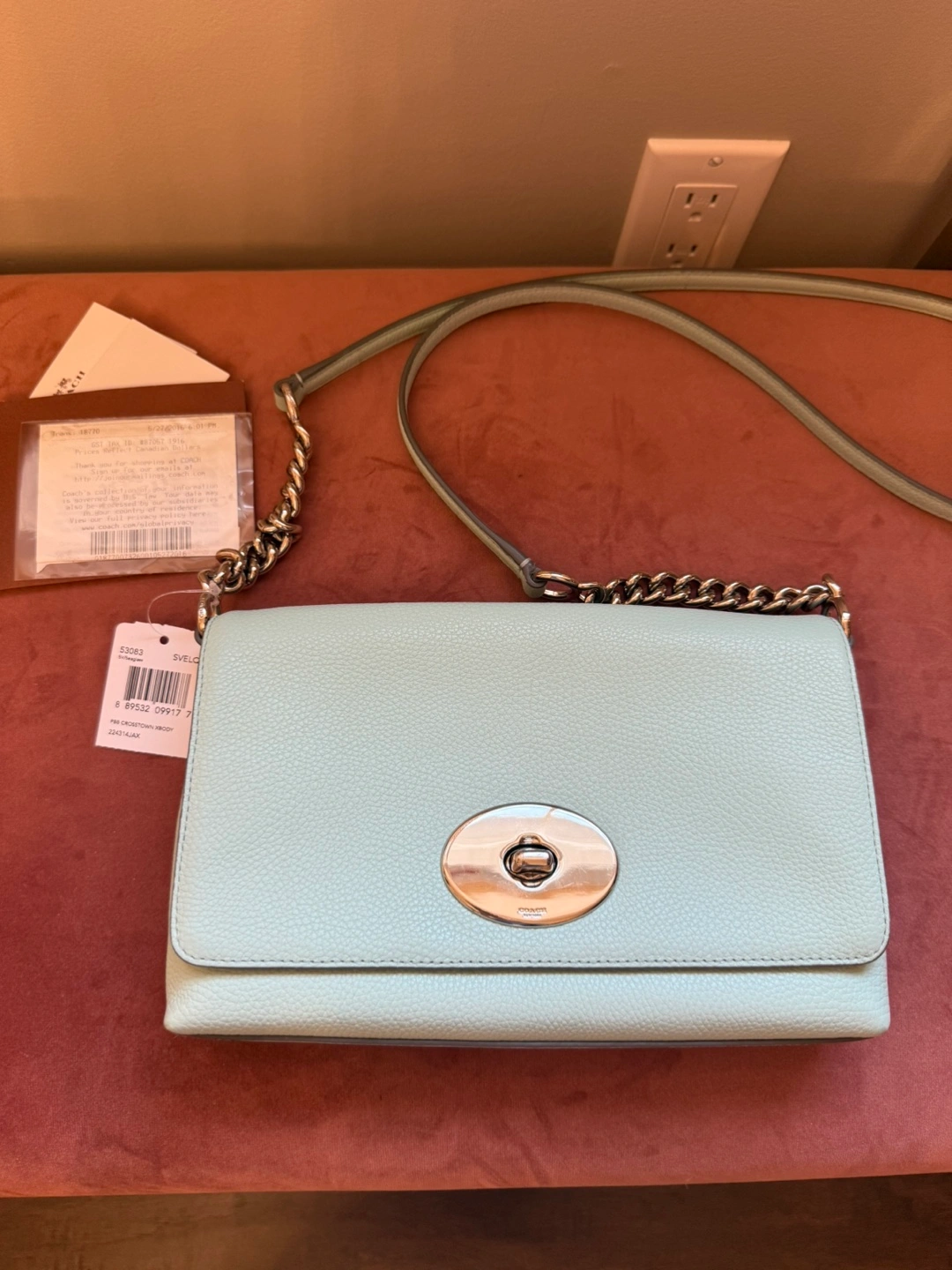 100Selling a New Coach Crosstown Xbody bag in a beautiful light blue/mint colour called Seaglass. The bag features a stylish chain strap and the classic Coach design. Polished pebble leather · Interior has a slip-in pocket · Turn-lock closure · Fabric lining · Strap with 22" drop for shoulder or crossbody wear · 9" L x 5.5" H x 2" W · Style No: 53083 I live in Markham and ONLY can meet you at these location in Markham: Petro Canada Gas station: corner of 16 ave and 9th line 9259 Ninth Line Or Shoppers drug mart of Hwy7/Wooten way 6579 Highway 7 East, Markham