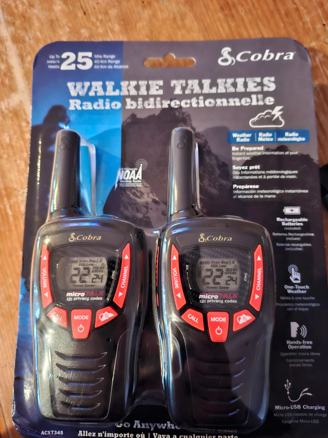 101Selling a brand new pair of Cobra MicroTalk walkie talkies! They come in the original packaging and are ready for your next adventure. Key features include: - Up to 25-mile range - Weather radio with NOAA alerts - 121 privacy codes - Rechargeable batteries included - Micro-USB charging