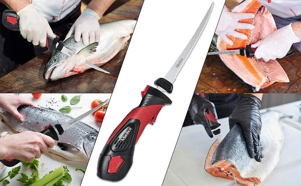 244Cordless Electric Fillet Knife, with 5 Ti-Nitride S.S. Coated Non-Stick Reciprocating Blades. New in box. Pick up is in Ajax, close to harwood bayly intersection. Recommended uses: Camping, Fishing. Cordless, Rechargeable. Mershca Cordless Electric Fillet Knife is the ideal professional fish cutting set. It is equipped with 5 replaceable professional stainless steel fishing knives, 2 replaceable rechargeable batteries, and a very practical storage handbag. The blades are super sharp and have just the right amount of stiffness and flexibility. This set meets all your needs! Our Set have 2 replaceable rechargeable batteries. It works for 40 minutes on a full charge, you can handle about 15 to 20 marine fish of 10 to 25 pounds on one battery. The removable batteries allow you to replace useful batteries without waiting for recharging. 5 replacement knives of different sizes. 5.5”: Crappie, Bream, Trout, Yellow Perch, Whitefish, White Bass; 8”: Catfish, Bass, Walleye, Snook; 8” Fine: Snapper, Cod, Flounder; 10”: Tuna, swordfish, Halibut. 10" Fine:Tuna,Salmon,ocean perch. The variety of blades provides the ability to choose according to the size and type of fish. Non-slip grip handle for outstanding grip security providing ultimate knife control with a trigger guard for added security. At the same time, before use, you need to press the safety lock and then turn on the power switch. Product in use to increase security, let us use more peace of mind. Our fish knives come with a high quality storage handbag, so you can pack all your accessories in the handbag and easily carry them anywhere you want go.