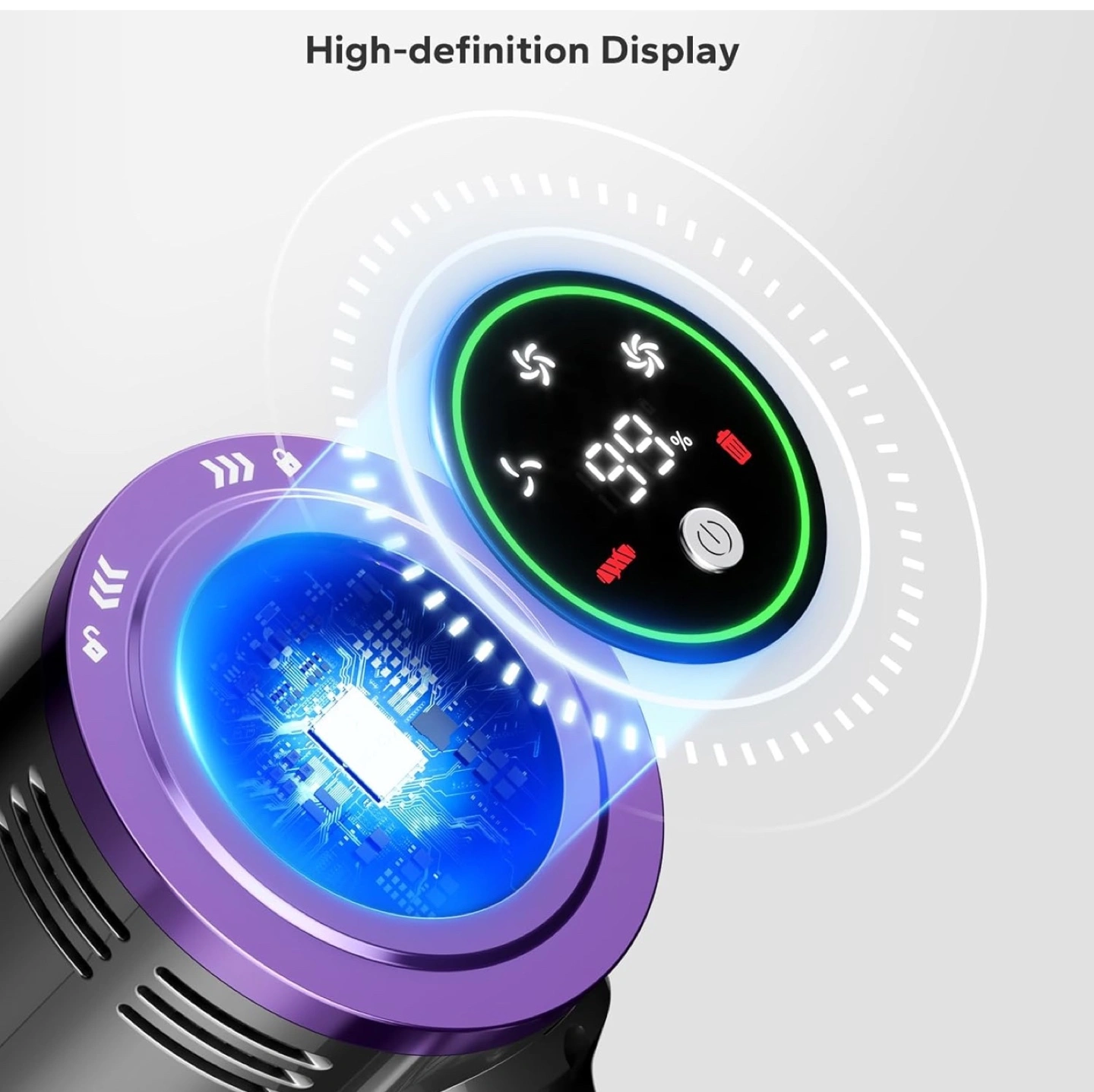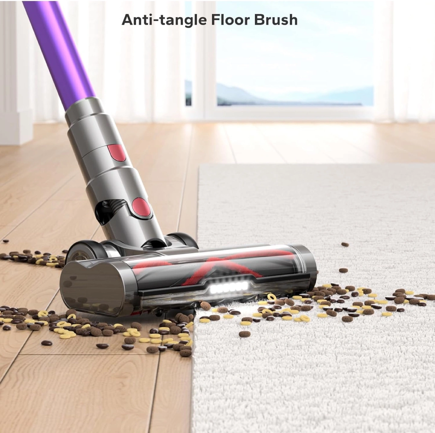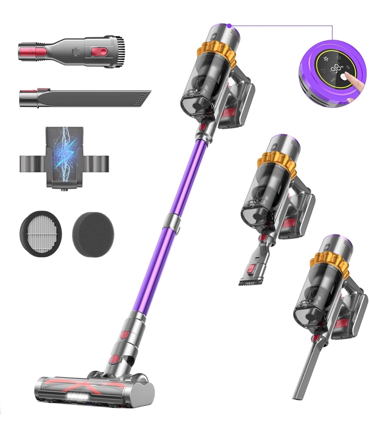 New Powerful suction, long battery life. Lightweight and versatile design. Includes various attachments for different cleaning needs. Digital display shows battery level and cleaning mode. Anti-tangle floor brush.