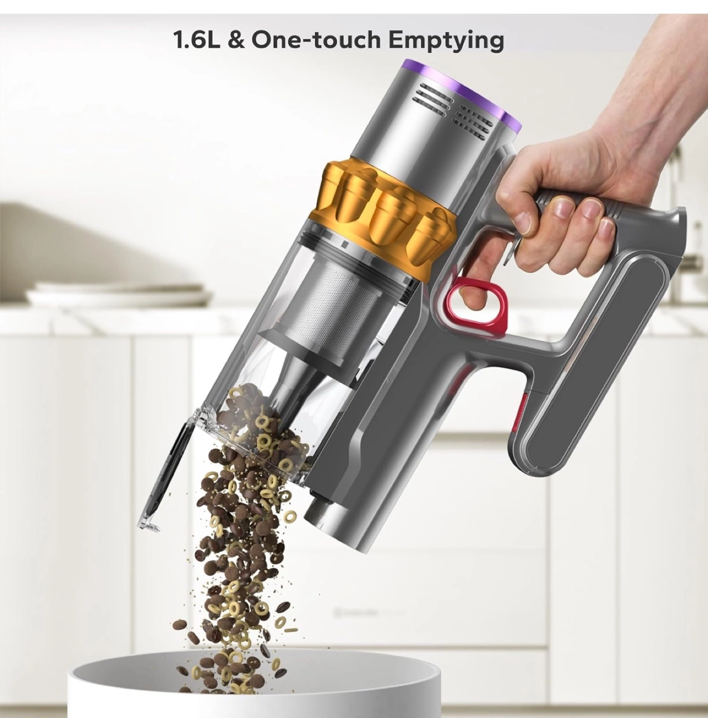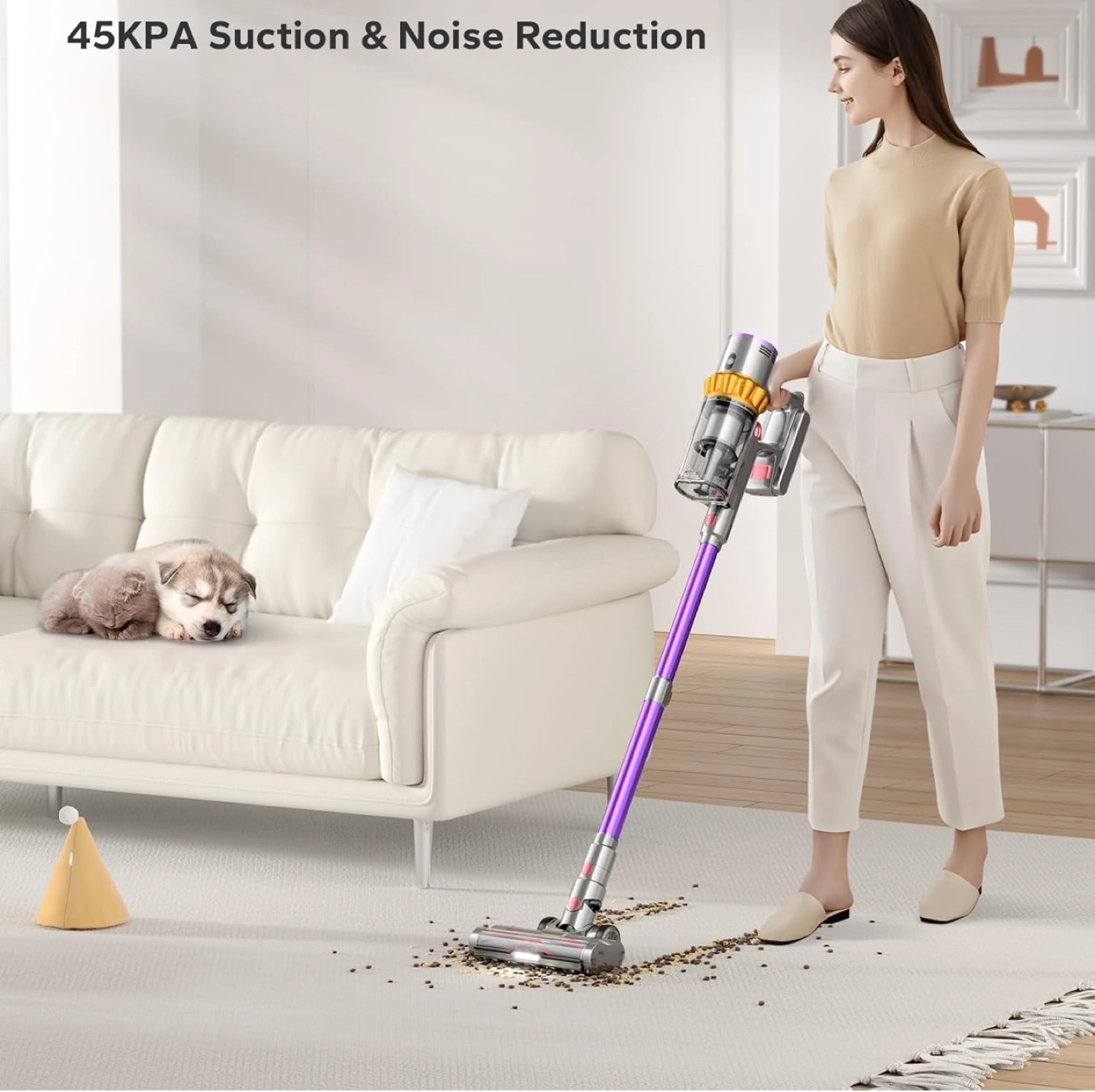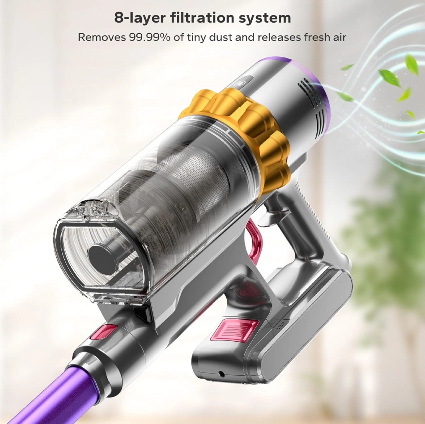 New Powerful suction, long battery life. Lightweight and versatile design. Includes various attachments for different cleaning needs. Digital display shows battery level and cleaning mode. Anti-tangle floor brush.