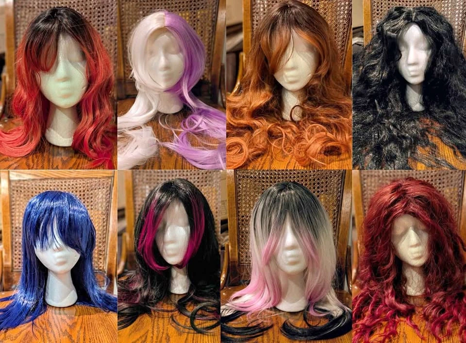 170All new, never worn! 8 to choose from ✨ Priced individually (all are $20/each except the blue is $15) Each comes in plastic bags with hair net and wig cap! All of them (except blue & black) have stretchy Rose Net caps that fit most heads. The black and blue have an adjustable elastic cap. 👉Sorry, no try ons. #1 - wavy orangey red ombre in brown roots. Super cute 18" #2 - Sigma Anime inspired half white/purple with longer section approx 28" , the bob section is really nicely shaped. #3 - Natural orange ombre into brown, gives off a Julia Roberts in 'My Best Friends Wedding' vibe. Curly 26" #4 - Classic witchy vibes, frizzy volume and jet black 26" #5 - Pin straight navy blue, shiny 18" #6 - Long layered black with pink highlights throughout in particular for bangs, very nice face framing 24" #7 - Tri color ombre with black roots, white and pink, face framing layers, nice quality and very attractive 24" #8 - Chappell Roan vibes burgundy curls the blend into brighter red tips. Lots of volume, easy to fluff up 26"