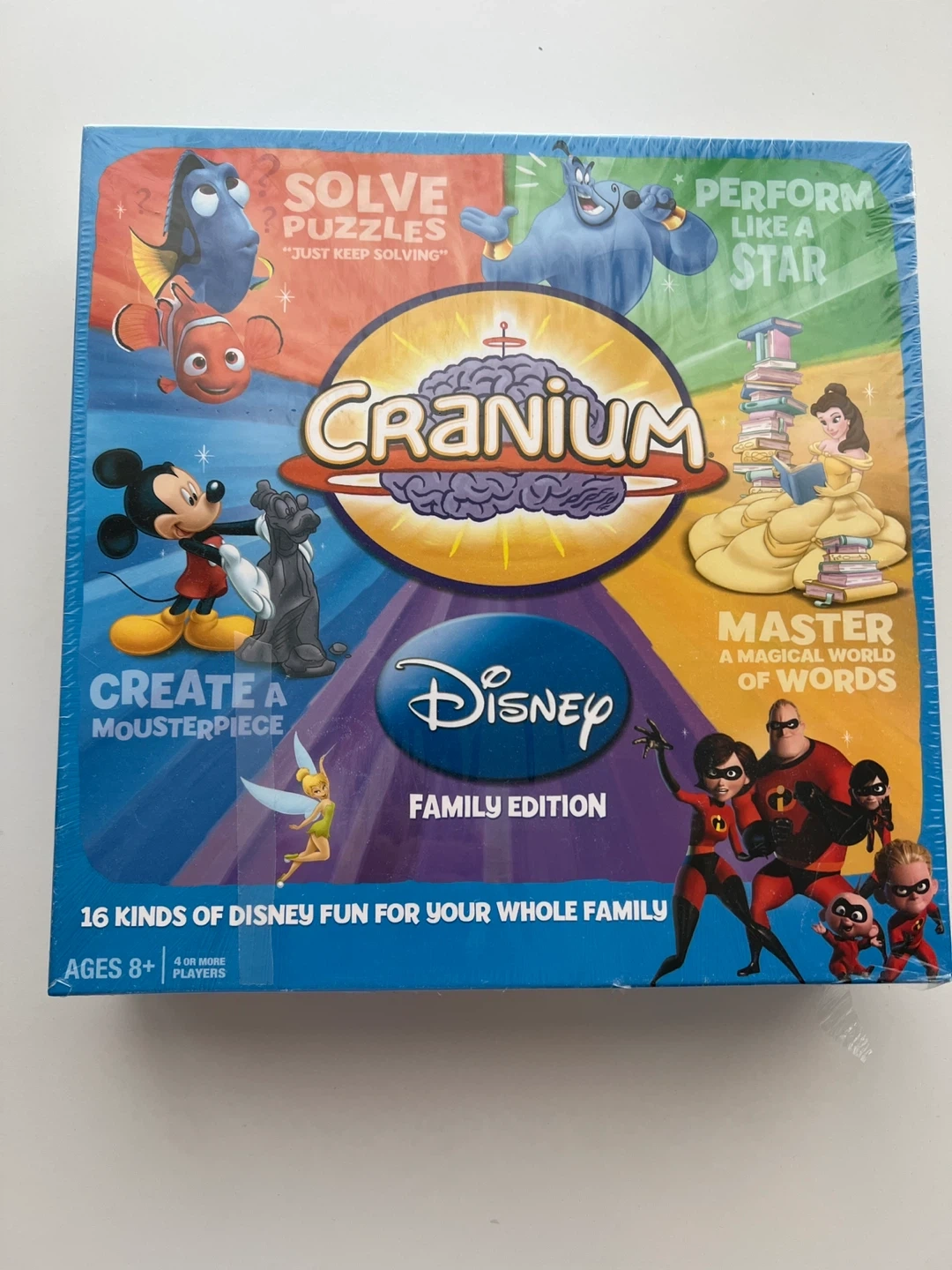 10Selling a brand new, still-in-shrink-wrap Cranium Disney Family Edition board game! This game includes a custom game board, 400 cards, a tub of Cranium Clay, 6 Cranium Cubes, a die, a timer, and Mickey Ears movers. It's perfect for family fun with 16 different Disney activities. Recommended for ages 8+