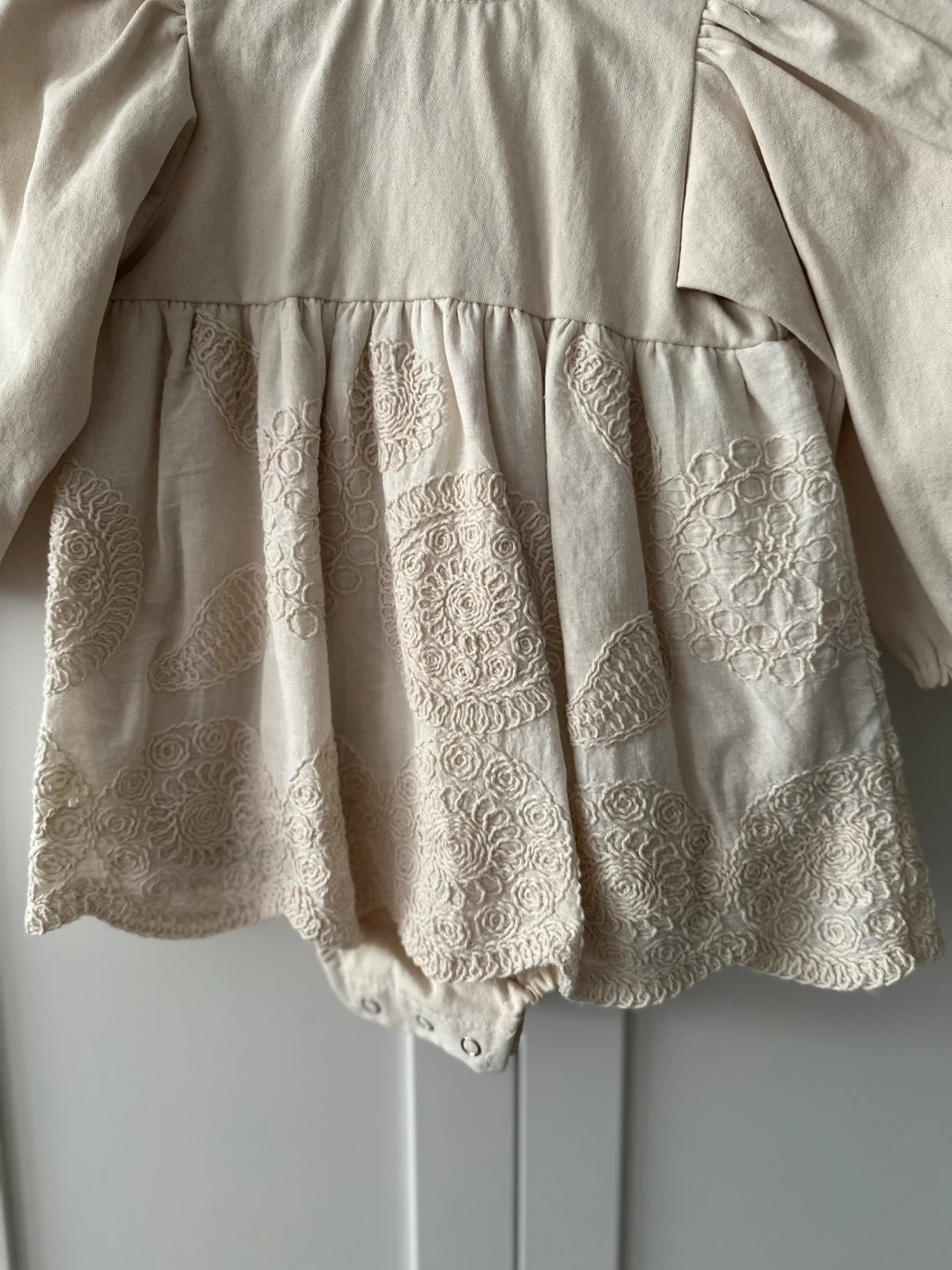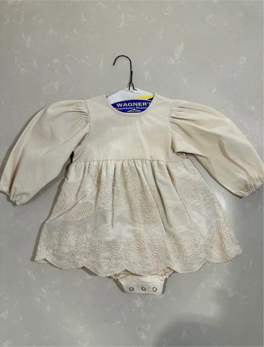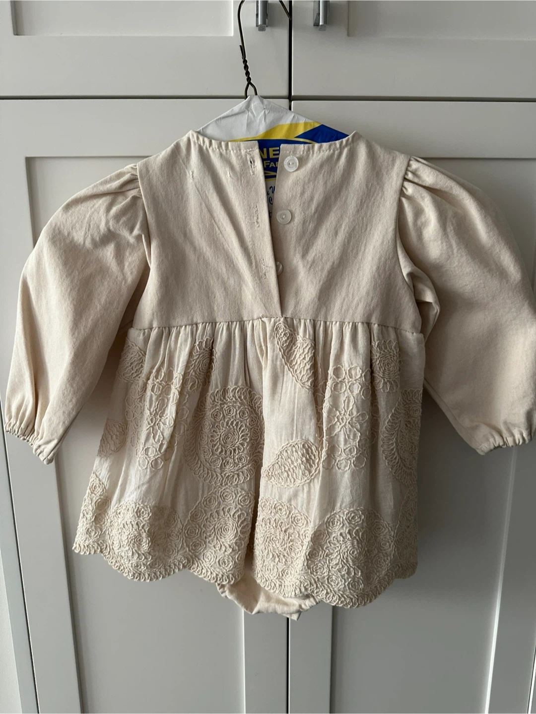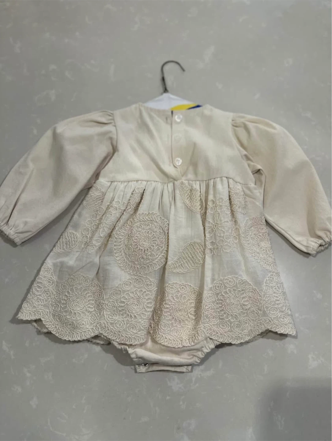 Adorable cream-coloured baby dress with delicate embroidery detailing! It's in great condition and ready for a new little one to wear. Perfect for special occasions or just looking extra cute Made in Korea In a pet-free and smoke-free home