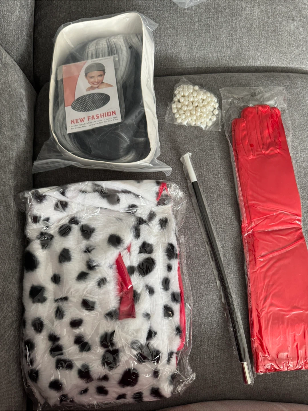 36I'm selling a brand new Cruella Deville costume set! It includes the Dalmatian-spotted coat, a wig, a wand, gloves, and some faux pearls. Perfect for Halloween or dress-up! Original price $25
