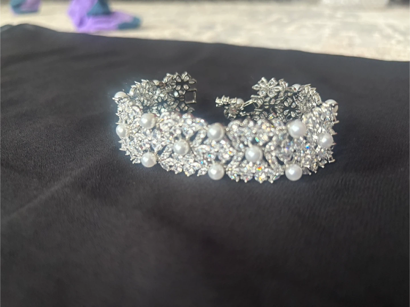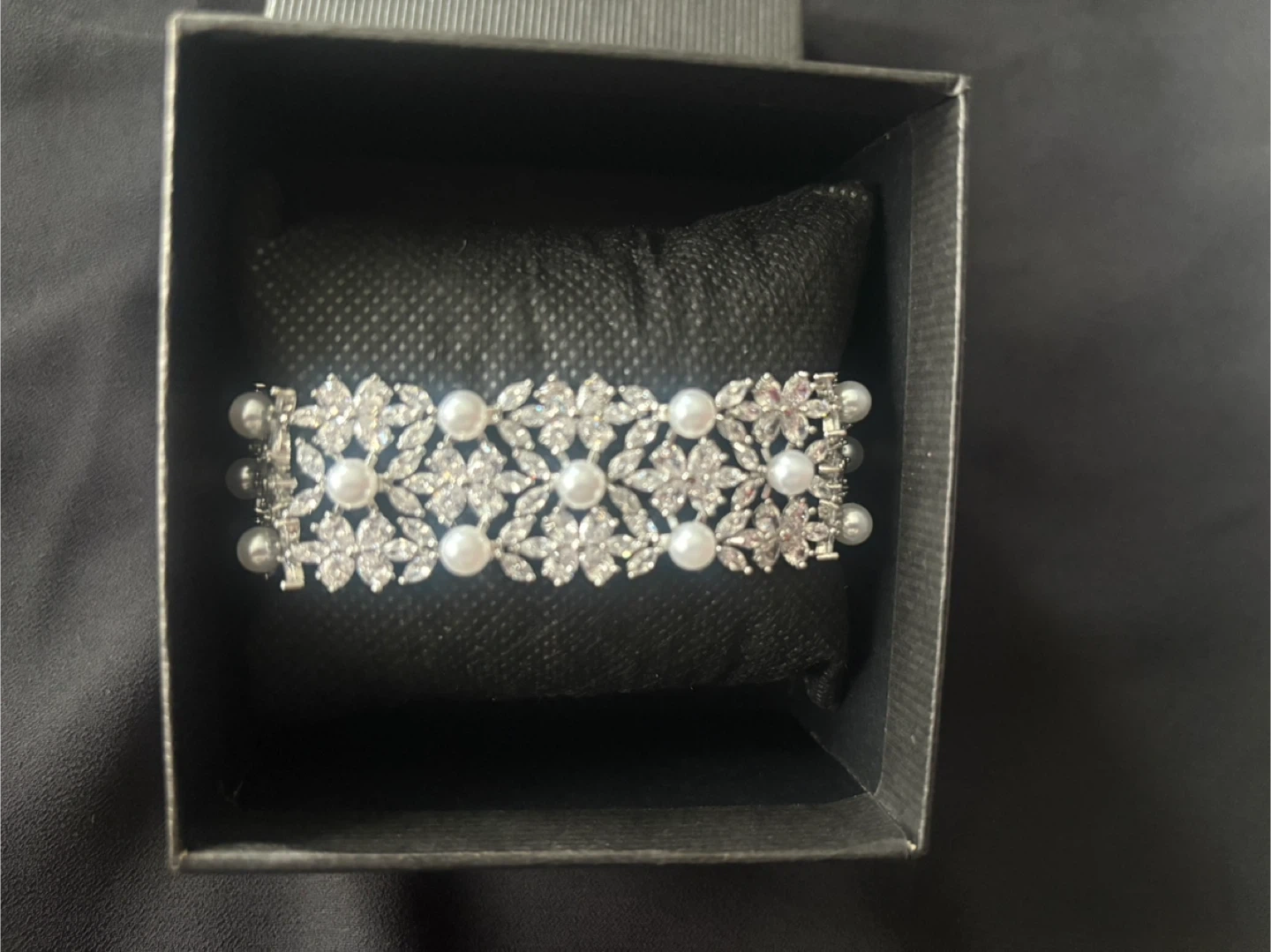 325Selling a brand new, gorgeous cubic zirconia pave bracelet with pearl accents! It has a diamond-like perfect cut and comes in its original box. The bracelet is 17.5cm long and 2cm wide, with a 2cm extension for a bigger size if needed