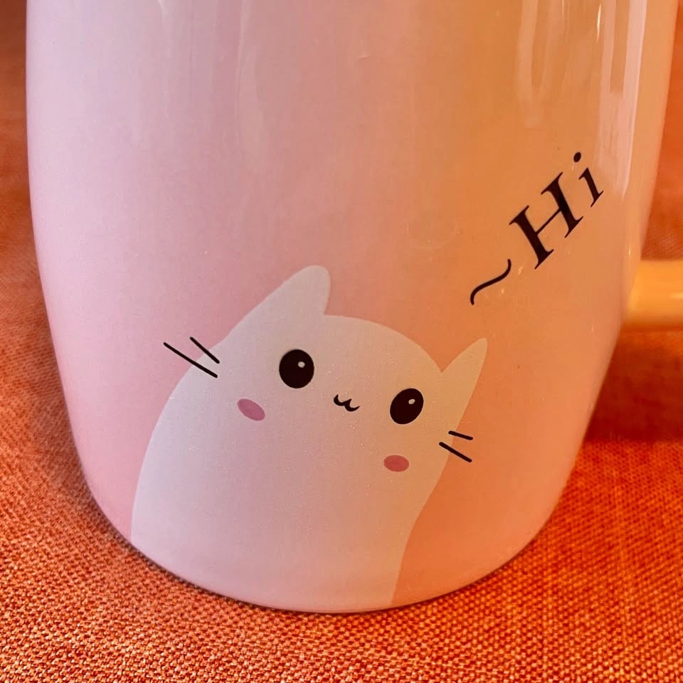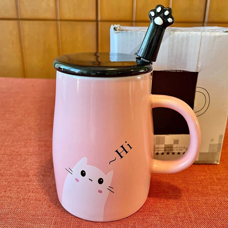 86Pick up at Don Mils & Steeles Adorable pink mug featuring a cute cat design. Comes with a black lid and a paw-shaped spoon. Condition: NEW with original box (The box shows signs of aging with some tears)