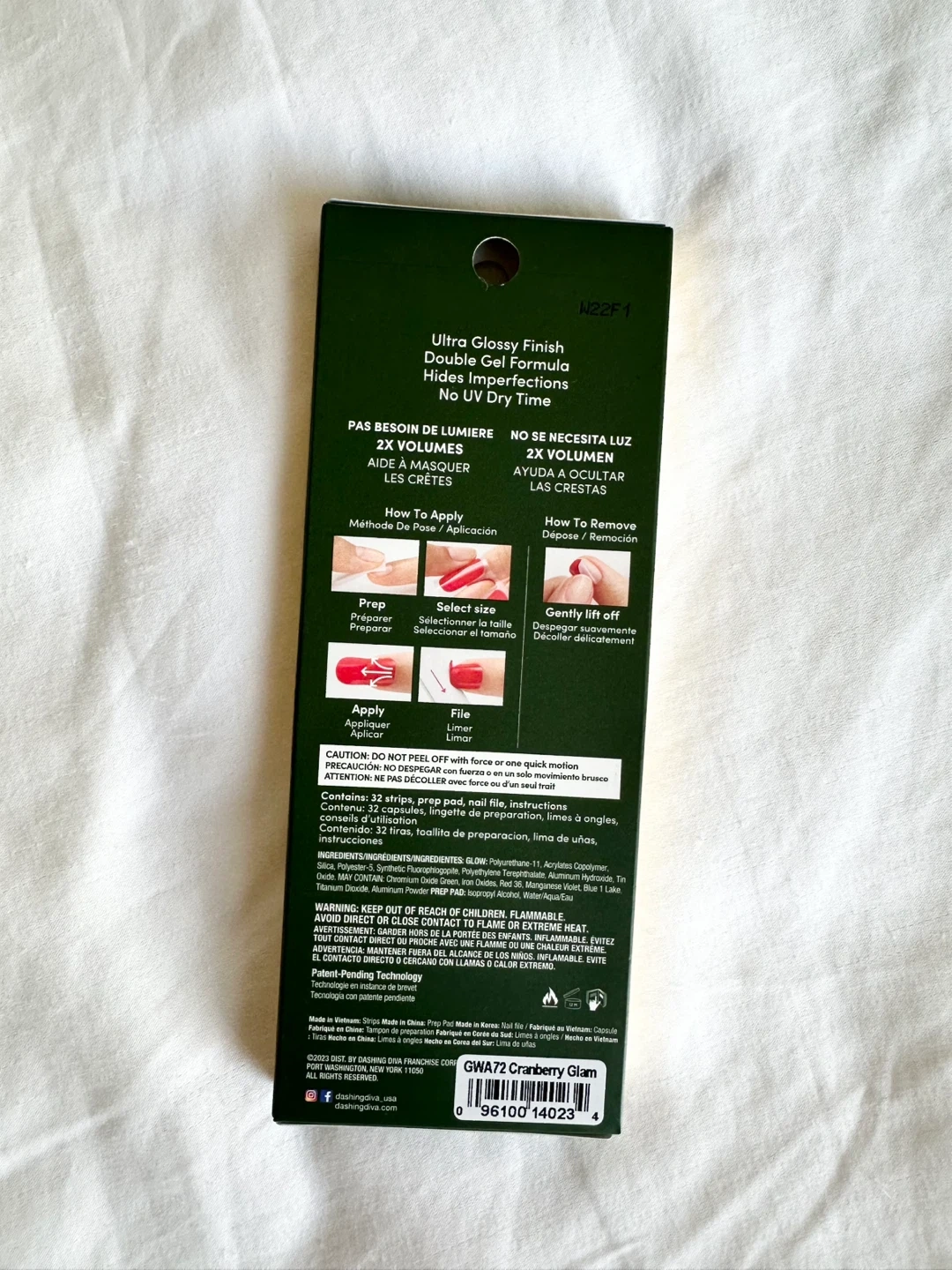 808New Dashing Diva Glow Real Salon Gel nail strips in Cranberry Glam. They last up to 14 days. - Ultra glossy finish - Double Gel Formula - Hides imperfections Package contains 32 gel nail strips, prep pad, nail file, and instructions. Pickup in Richmond, cash only.