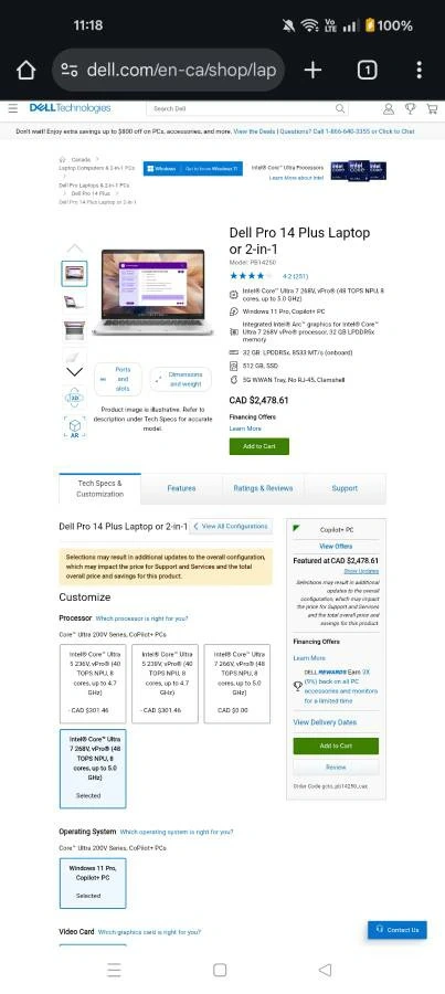 10text me at 647-492-4932 for a quick reply please do not send me offers for a lower price The laptop is brand new sealed in box. Under Dell ProSupport warranty (with accidental damage protection) until September 2028 (linked to serial number, can show in person). The laptop retails for 2.5k before tax on the Dell Canada website (Ultra 7, 32gb ram, 512gb SSD, 14" touch): https://www.dell.com/en-ca/shop/laptops-ultrabooks/dell-pro-14-plus-laptop-or-2-in-1/spd/dell-pro-pb14250-2-in-1-laptop/gcto_pb14250_cax?redirectto=SOC&configurationid=54ed1103-c49e-4c54-bacc-2959bad587e7 Dell Pro 14 Plus laptop Aluminum Laptop with A.I chip, Copilot (Model PB14250): - Intel Core Ultra 7 255U Processor (12 TOPS NPU, 12 cores, up to 5.2 GHz) - 32GB RAM: 2 x 16GB DDR5 5600 MT/s, 512GB SSD - 14 inch Touch FHD+ 1920x1200 300 nits 100% sRGB ComfortView Plus, Pen Support - Integrated Intel graphics for Intel Core Ultra 7 255U processor - 1440p 5MP HDR + RGB IR Camera with Presence Detection, Facial Recognition, TNR, Camera Shutter, Microphone - Intel Wi-Fi 6E AX211 2x2 802.11ax, Bluetooth 5.3 card, Multi-touch gesture-enabled precision touchpad - 2x Thunderbolt 4 (40 Gbps) with DisplayPort 2.1 Alt Mode/USB Type-C/USB4/Power Delivery ports - 1x USB 3.2 Gen 1 Type-A port with PowerShare, 1x USB 3.2 Gen 1 Type-A port, HDMI 2.1 port, headset jack, no RJ-45 - Stereo speakers with Cirrus Logic codec for audio processing - English US backlit Copilot key keyboard, 65W AC adapter USB Type-C, Energy Star Qualified - 55 Wh ExpressCharge Capable Battery , ExpressCharge Boost Capable