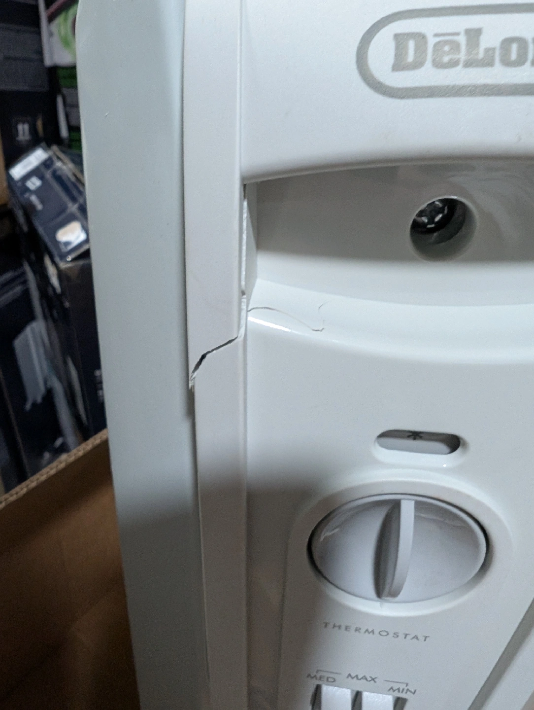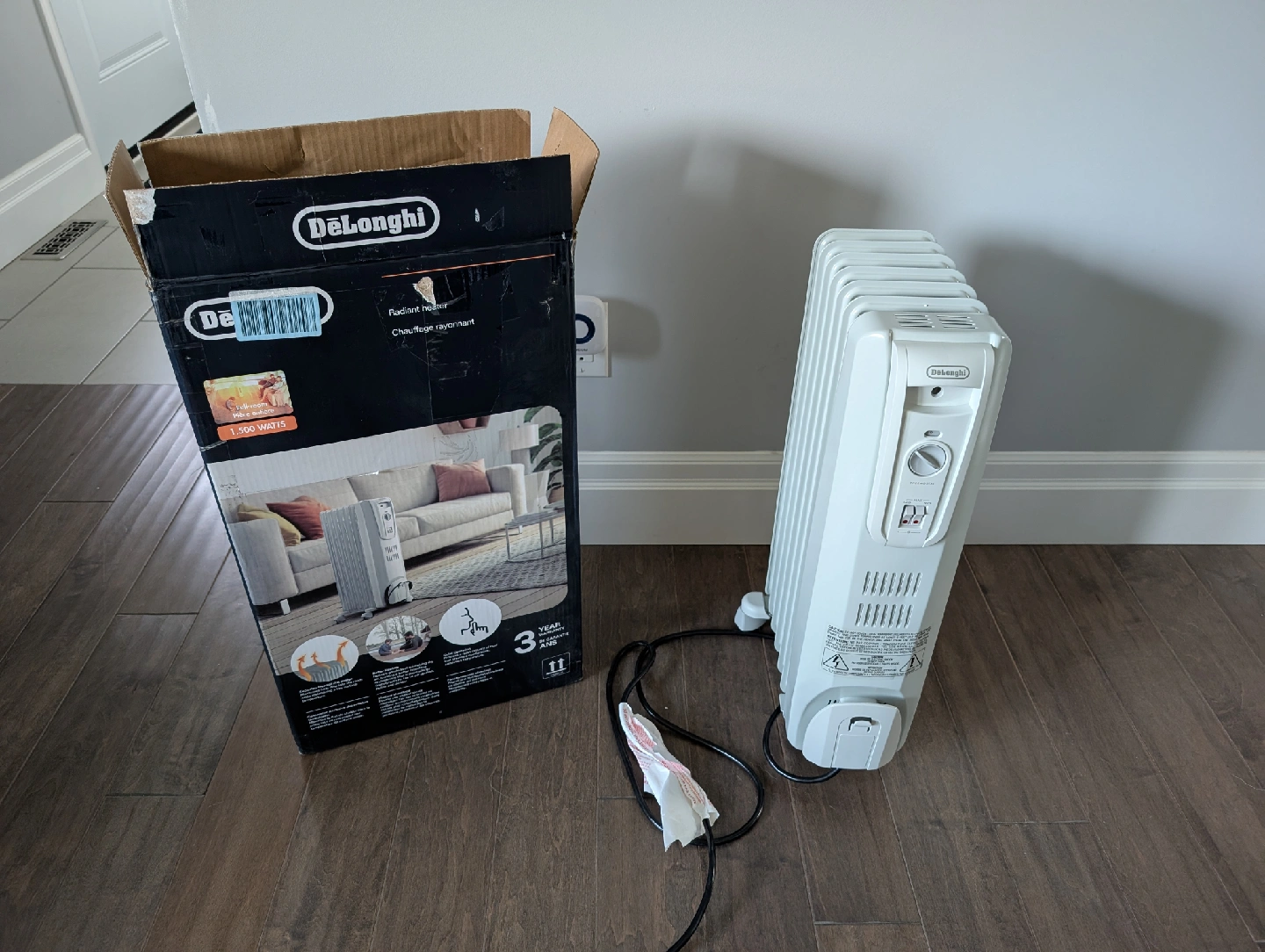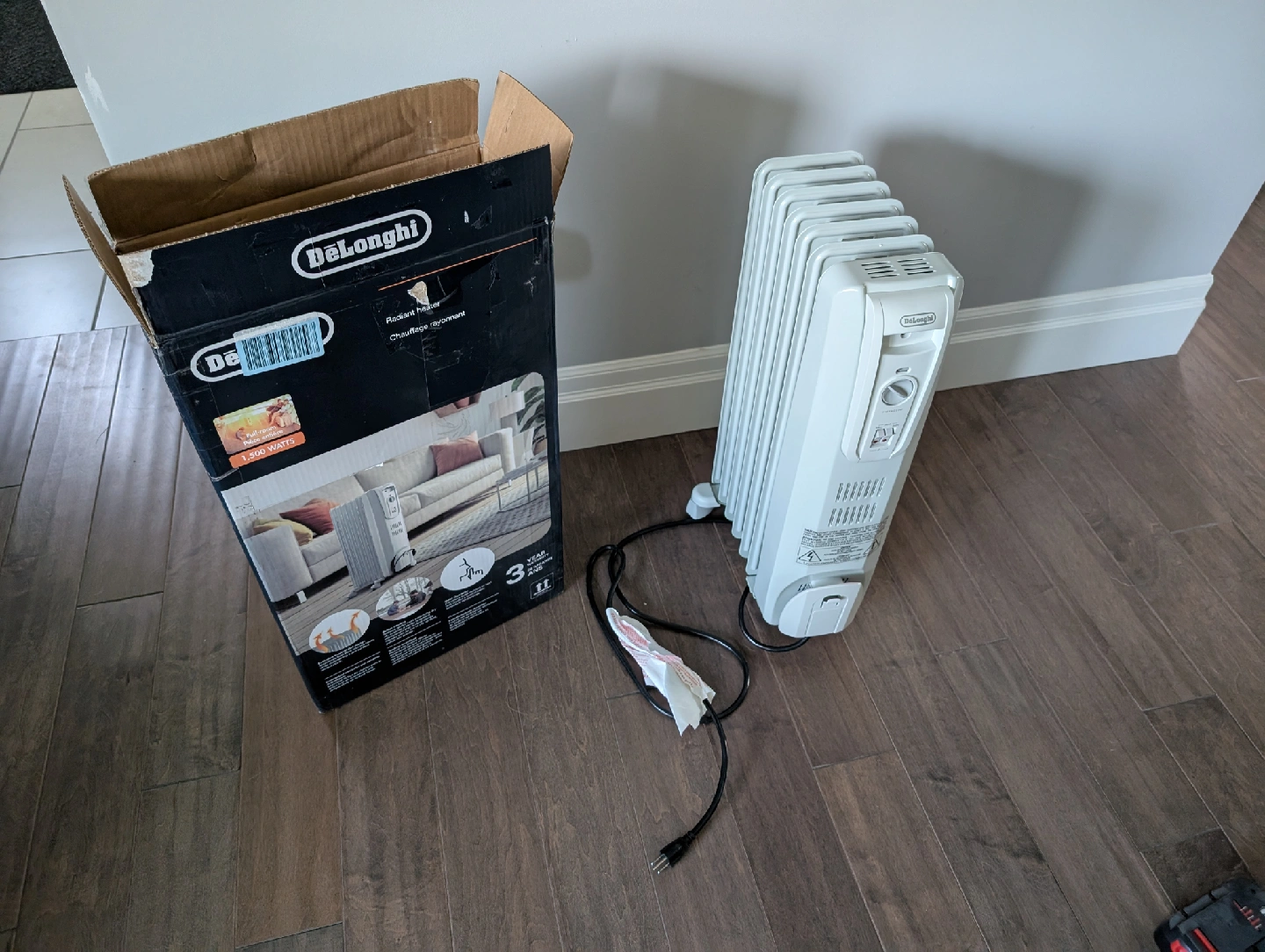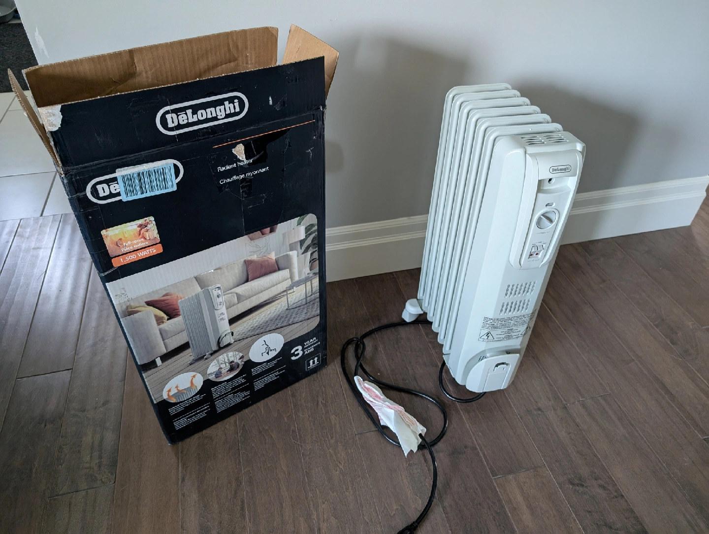 231New De’Longhi oil filled radiator space heater. Full room, quiet, 1500W, adjustable thermostat 3 heat settings, energy saving, safety features, metal construction. Have small dent or crack, does not affect functionality at all. $60 FIRM each. Heater, Heat, Warmth, Heating, Winter, Cold, Warm, Delonghi, De’Longhi, Radiator, Room, Portable, Watt, Oil, Thermostat, Quiet, Space, Metal