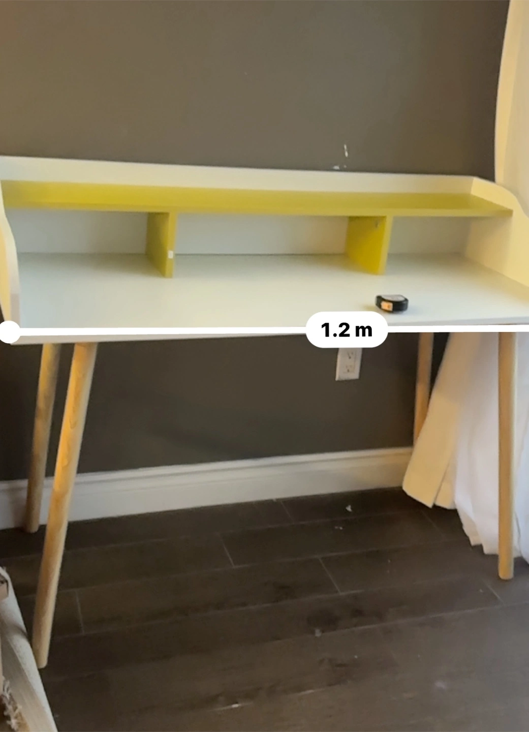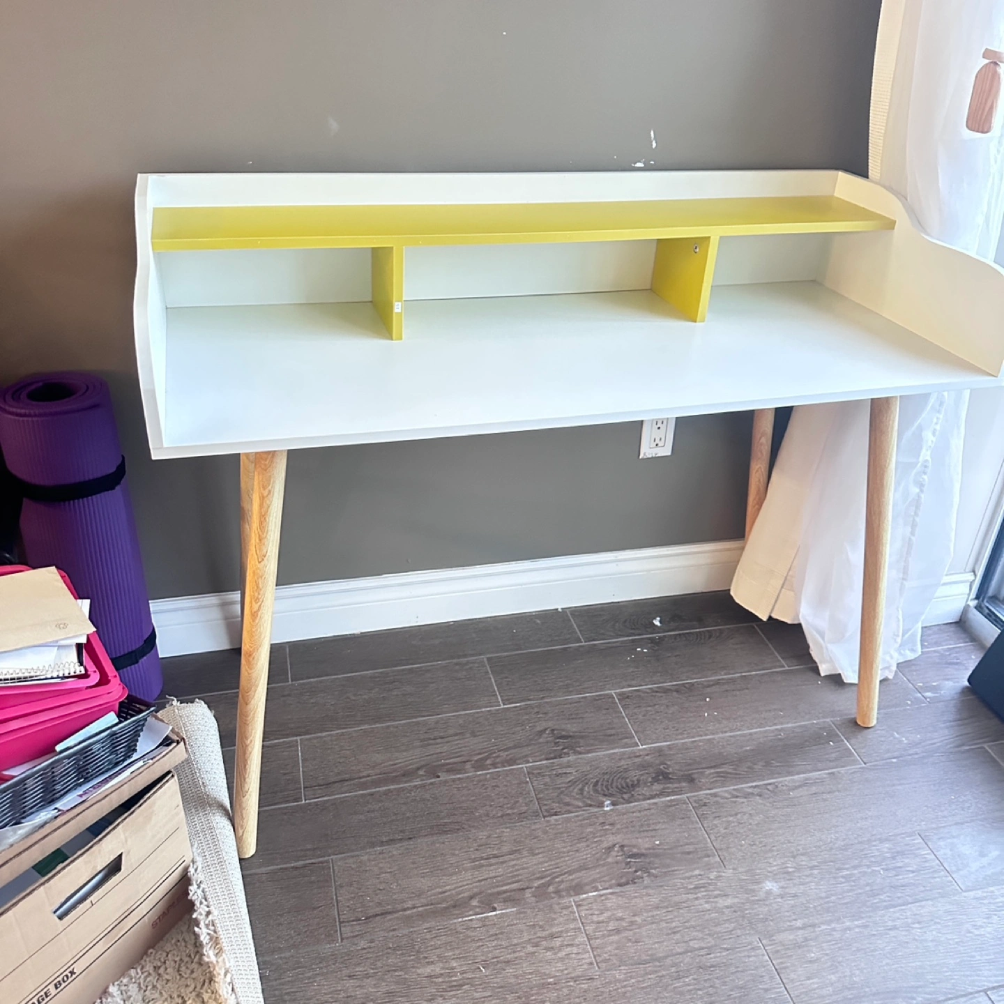 New just assembled too big for my spot; Modern desk, white and mustard yellow. Features a shelf and wooden legs. Approximately 120cm wide and 54cm deep. Good condition. Easy Take out the legs for transport From pet/smoke free home Not delivered Not hold Not e-transfer Cash and carry Serious inquiries please