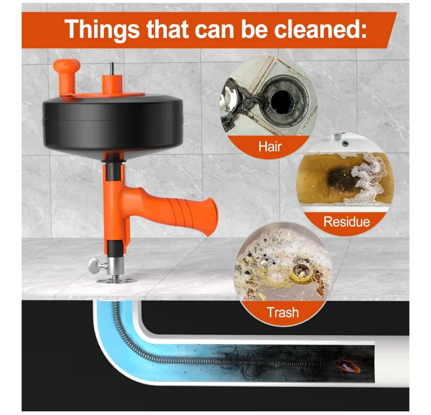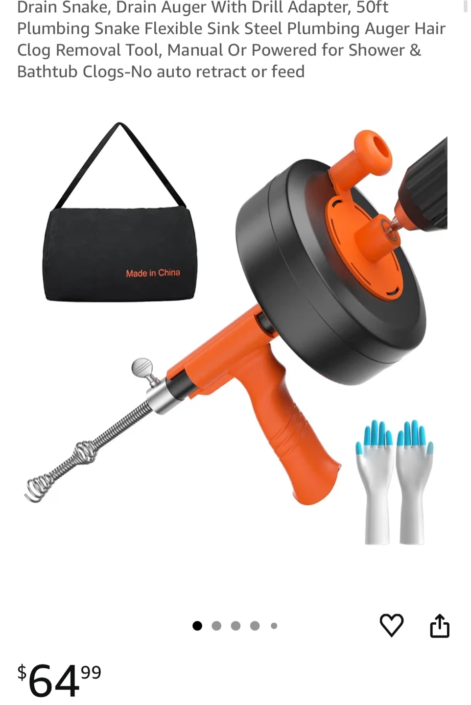 60I'm selling a brand new drain snake auger with a drill adapter! This flexible sink steel plumbing tool is perfect for hair clog removal in showers and bathtubs. It can be used manually or powered for extra cleaning power. Comes with a handy carrying bag!
