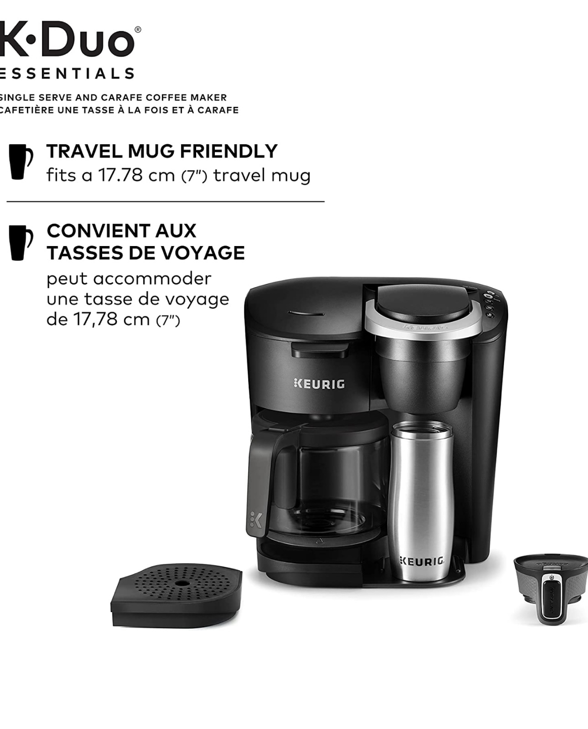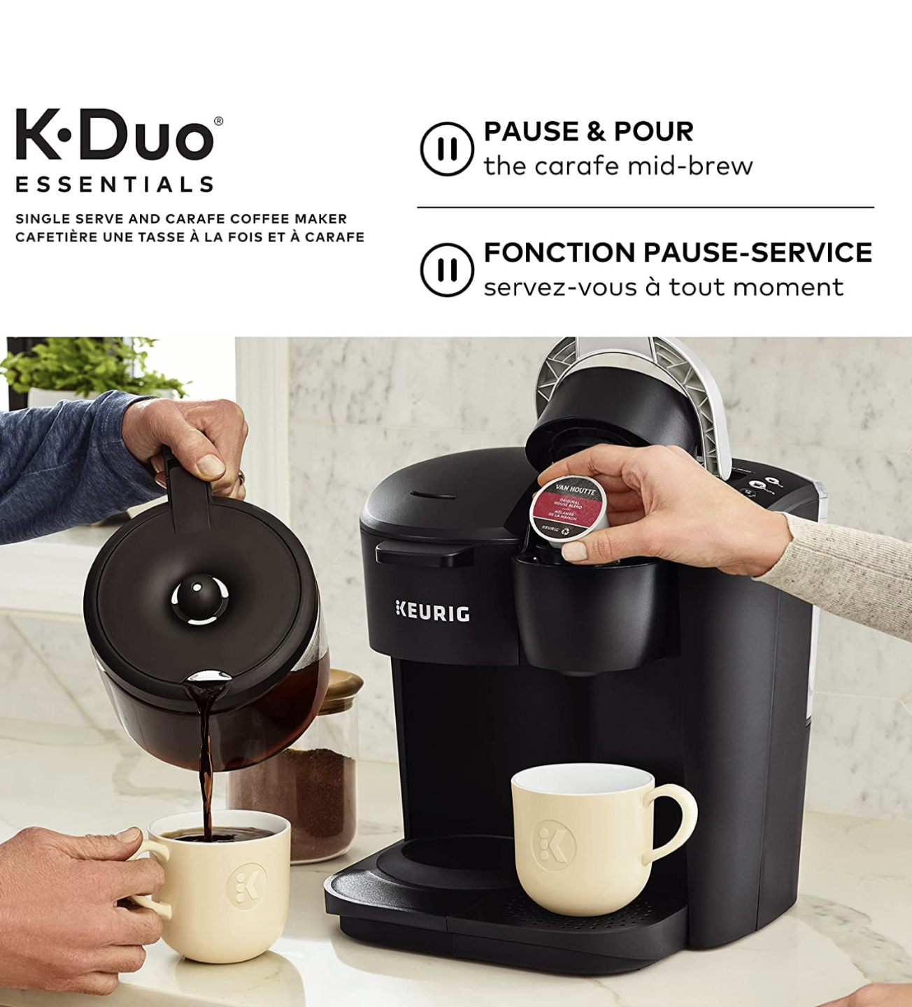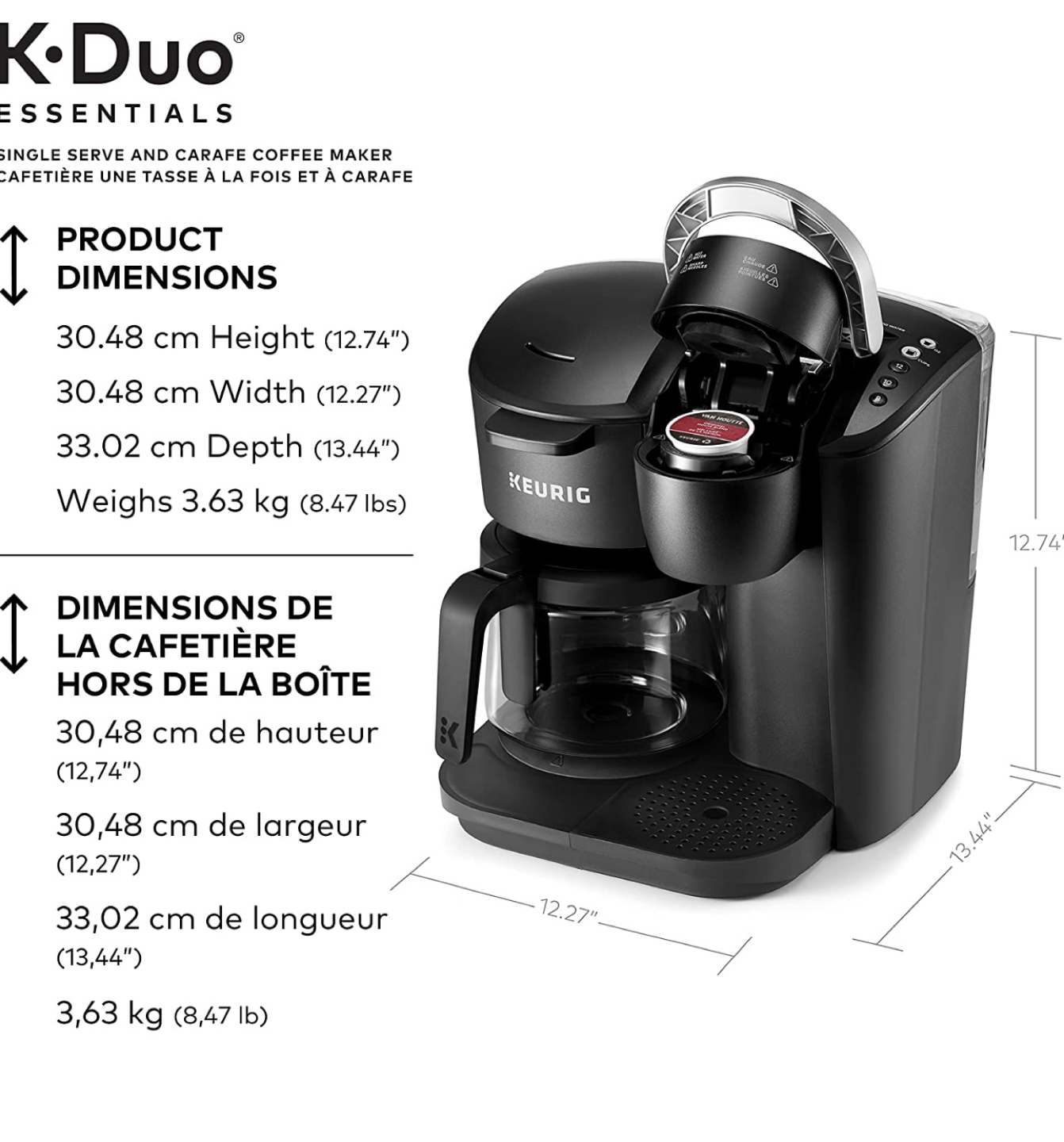 40Contact for the price New Final sale ( it will be test before you buy Pick up 16 th ave and 9 line Introducing the K-Duo Essentials Single Serve & Carafe Coffee Maker: the perfect coffee maker for any occasion. This versatile coffee maker is the best of both worlds, using both K-Cup pods and ground coffee to brew a cup and a carafe of your favourite varieties. The included 12-cup glass carafe and heating plate are perfect for keeping your coffee hot, and the added convenience of the Pause & Pour feature makes serving a snap! No need to wait for the entire carafe to brew – the Keurig K-Duo Essentials coffee maker can be paused mid-brew for 20 seconds, so you can pour fresh, hot coffee right away. Create your perfect cup and carafe every time with the K-Duo Essentials coffee maker. Choose your favourite ground coffee, or choose from hundreds of delicious K-Cup pod varieties of coffee, tea, cocoa, and more. With multiple brew sizes, you can make an 8, 10, or 12-cup carafe for large gatherings, as well as a 237, 296, or 355 ml (8, 10, or 12 oz) cup just for you. You can brew the perfect amount of fresh, full-flavoured coffee whether you’re hosting friends or just enjoying a cup – and a moment – to yourself. - BREW A CUP AND A CARAFE: Use both ground coffee and K-Cup pods. - MULTIPLE BREW SIZES: Brew an 8, 10, or 12-cup carafe and an 237, 296, or 355 ml (8, 10, or 12 oz) cup. - LARGE 1.77L (60 oz) WATER RESERVOIR: The 1.77L (60 oz) water reservoir is shared between the single serve and carafe brewing, saving you time and simplifying your morning routine. Removable reservoir makes refilling easy. - 12-CUP GLASS CARAFE: Included with your coffee maker along with a heating plate to keep coffee hot. - PAUSE & POUR: Automatically pauses your coffee maker mid-brew for 20 seconds, allowing the carafe to be poured. - ENERGY EFFICIENT: Auto off feature for both your coffee maker and your heating plate: - TURNS YOUR COFFEE MAKER OFF 1 minute after the last single cup brew - TURNS YOUR HEATING PLATE OFF 2 hours after the last carafe brew - TRAVEL MUG FRIENDLY: Accommodates travel mugs up to 7 inches tall. - COMPATIBLE WITH THE MY K-CUP UNIVERSAL REUSABLE COFFEE FILTER: Brew your own ground coffee (sold separately). - COMPATIBLE WITH GOLD TONE MESH FILTER: A reusable coffee filter you can use to brew your perfect carafe (sold separately). - SIMPLE BUTTON CONTROLS: Just insert any K-Cup pod or ground coffee and use the button controls to brew a delicious cup and carafe. See less