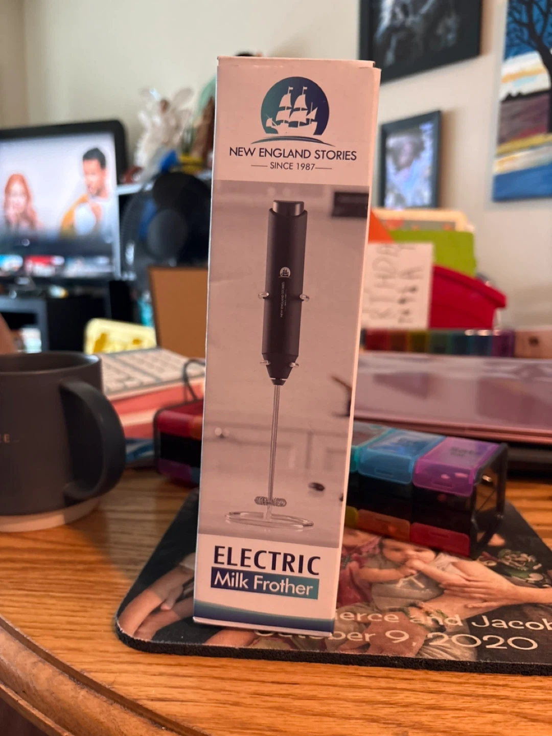 23I'm selling a brand new New England Stories battery powered milk frother! It's perfect for making lattes, cappuccinos, and more right at home. It's a handheld foam maker and mini whisk drink mixer for coffee, cappuccino, latte, matcha, and hot chocolate. It also comes with a stand. Requires 2 AA batteries (not included)