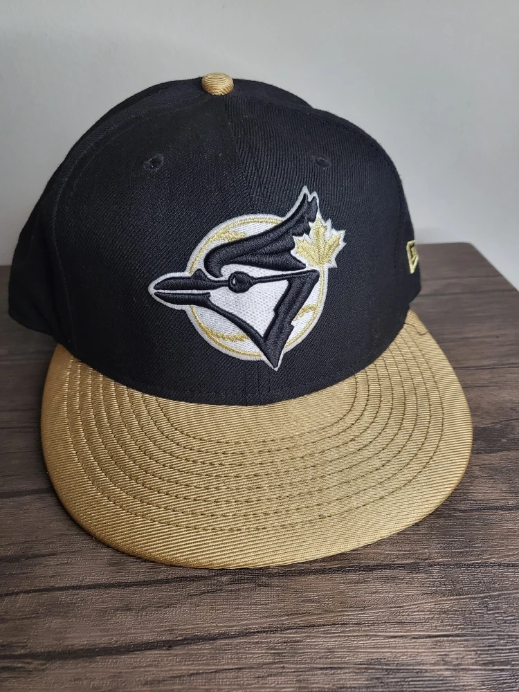 21Selling a New Era Toronto Blue Jays 59FIFTY fitted hat. It's black with a gold brim and the Blue Jays logo. The size is 7 5/8.
