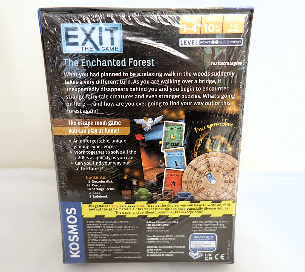Escape room game. Solve riddles and puzzles to escape the enchanted forest. For 1-4 players. 1-2 hour playtime. Includes game board, cards, and rulebook. Level: Novice to Expert.