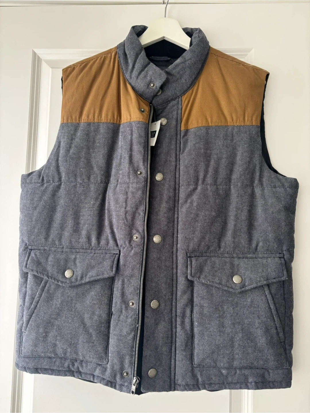10Selling a GAP puffer vest in a stylish grey and brown colour combination. It features a full zip closure and handy front pockets. Perfect for adding an extra layer of warmth on cooler days!