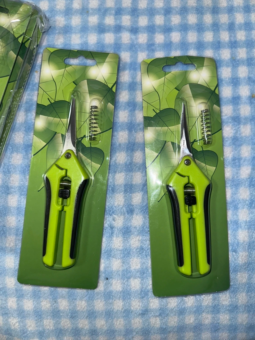 Pair of small gardening shears. Lime green and black handles. Stainless steel blades. Includes replacement spring. $ 5 each Stock: 5 pieces