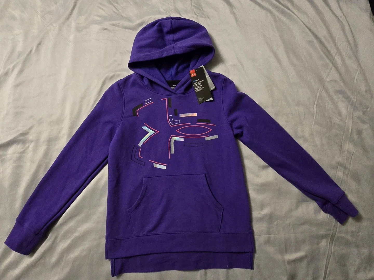282This is a brand NEW girls hoodie with tags by Under Armour! It's a vibrant purple colour and a size YLG (Youth 14-16). It has a kangaroo pocket and a cool design on the front. Perfect for staying cozy! Regular $50! Please check our listings for more great items for the whole family! Lots of previously loved and in great condition items! And... we have TONS of brand NEW items with tags! All for amazing prices!