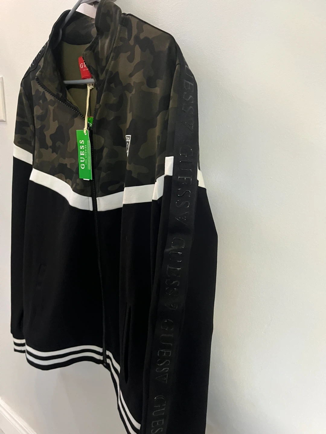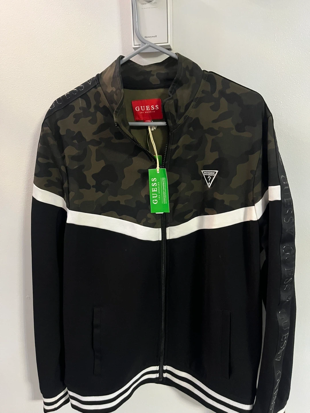 37Selling a stylish Guess track jacket. It features a cool camo and black design with the Guess logo on the sleeve. Perfect for adding a bit of flair to your wardrobe!