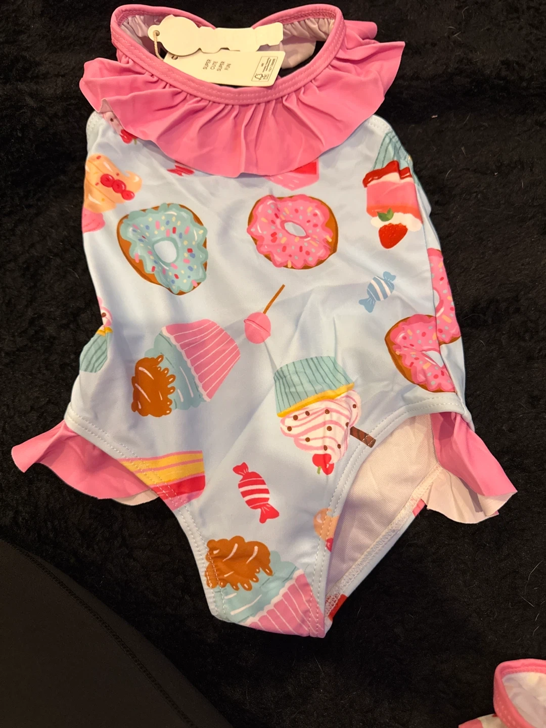 52This is a brand new H&M baby swimsuit, perfect for your little one! It's size 12-18 months and features a cute pattern with cupcakes and donuts. The swimsuit has pink ruffles around the neck and legs. It's never been worn and still has the tags attached