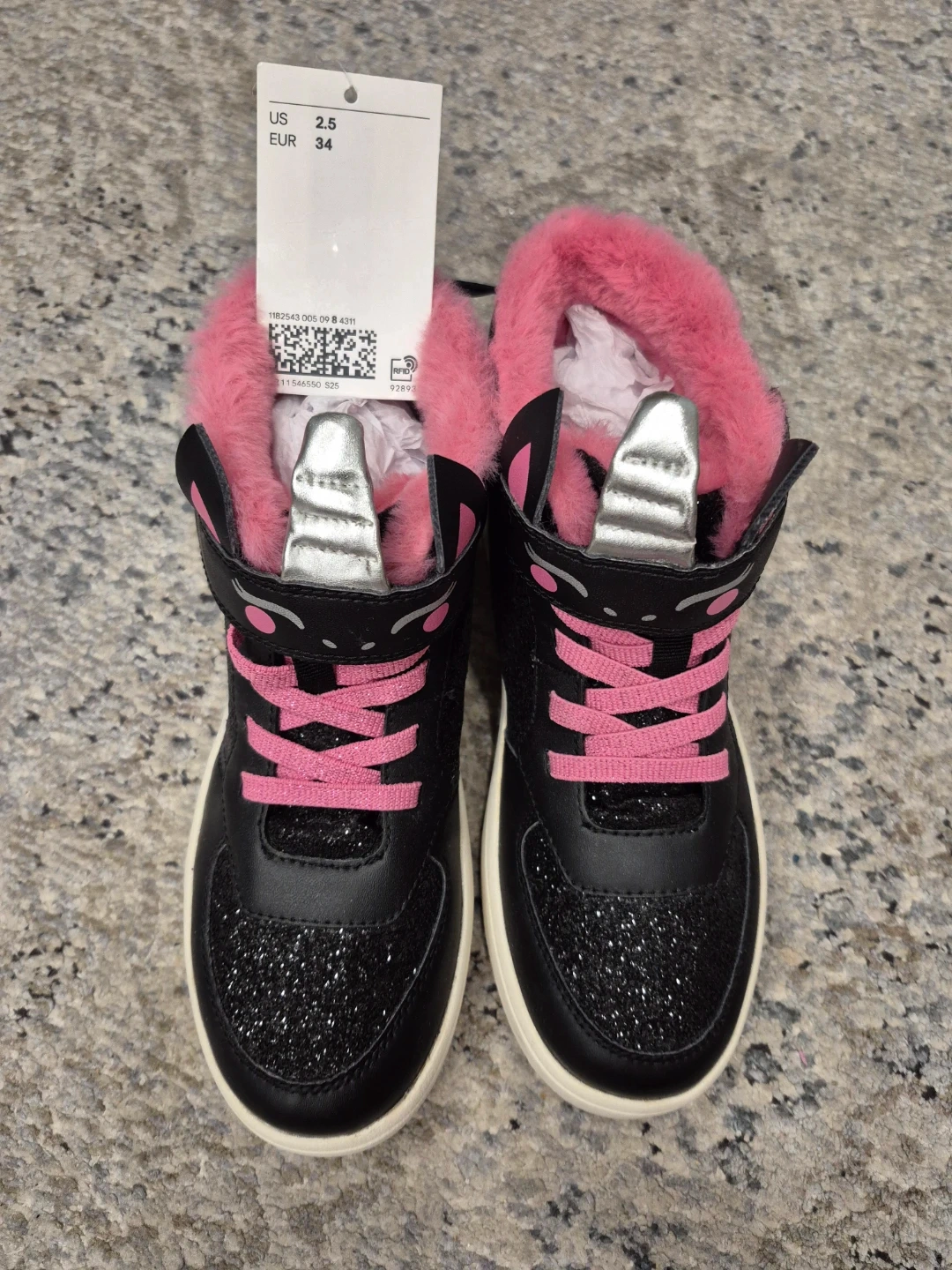 5These are brand new H&M unicorn high-top sneakers! They're black with pink laces and a fluffy pink lining. The size is US 2.5 / EUR 34.