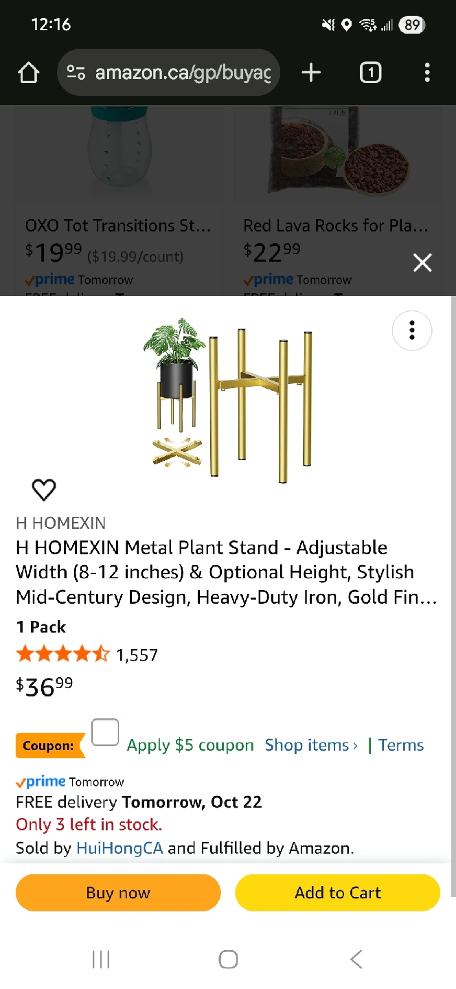 65I'm selling a brand new HOMEXIN metal plant stand [ONE Gold and ONE Black]! It features an adjustable width (8-12 inches) and optional height. It has a stylish mid-century design with a heavy-duty iron and gold/black finish. Originally bought for $31.99 + Tax and comes with all parts in the box as you can find in the pictures. Guaranteed never used BRAND NEW stands. Thank you =]