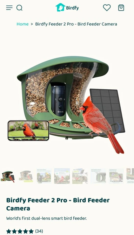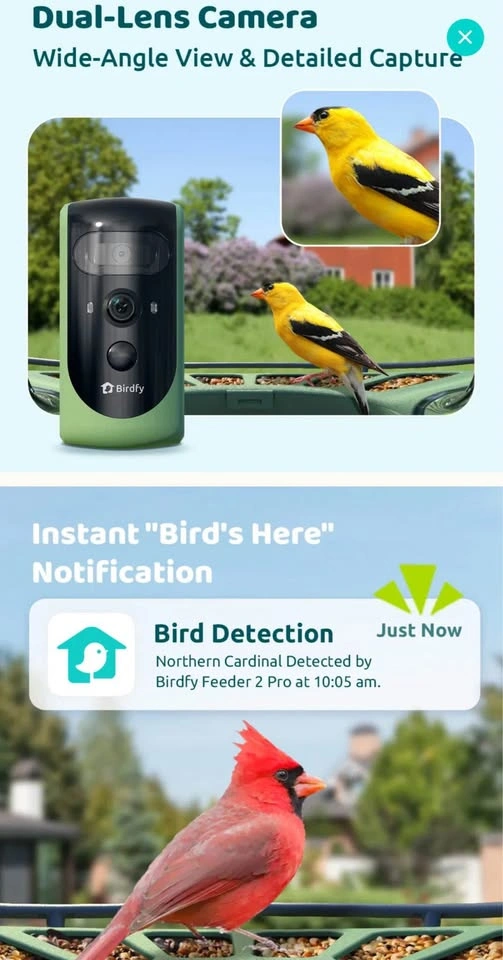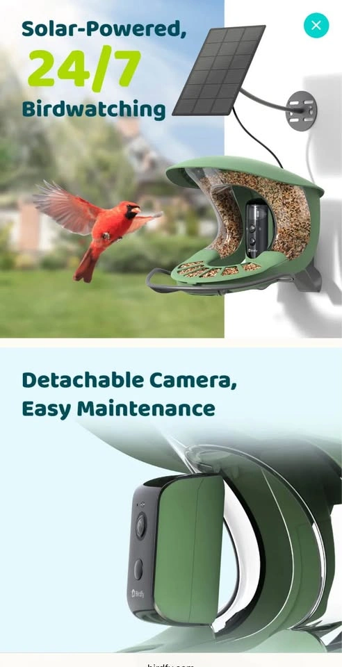 Get Wide-Angle Videos + Bird Portrait Photos. While the wide-angle lens captures video clips, the smart portrait lens automatically zooms in, sending feather-detailed bird photos straight to your device. Portrait Lens that Frames Birds in Perfect Focus. The portrait lens automatically tracks birds and adjusts for perfect framing, delivering stunning 2K bird-centered videos that can be replayed in slow-motion. AI Recognition of 6,000+ Bird Species. Learn and have fun with AI that identifies 6,000+ bird species. Instant "Bird's Here" Notification. A real-time visitor notification will bring you a smile. Comes with a Solar Panel. Go green with the solar panel included with this bird feeder. Endless Fun with Free Birdfy App. The Birdfy app is free to download and packed with fun features. Watch live bird feedings, receive instant alerts, enjoy auto-recorded clips, and get a monthly recap of your feeder visitors - all for free. Pick up - Courtice. Please check my other listings!