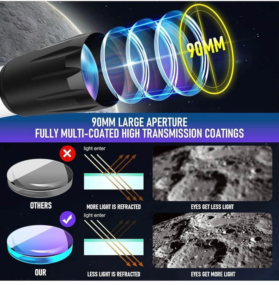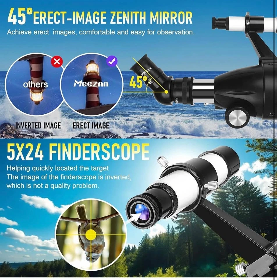 108New in box Meezaa professional telescope with a 90mm aperture, great for both kids and adults interested in astronomy! Perfect for stargazing, moongazing, city night views, bird watching, and outdoor scenery. Features: * 90mm aperture and 800mm focal length * High magnification (32X-240X) * Two interchangeable eyepieces (10mm and 25mm) * 3x Barlow lens * Adjustable tripod (28-46 inch) * Carry bag * Phone adapter Easy to set up and operate. Pick up in Courtice. Please check my other listings!